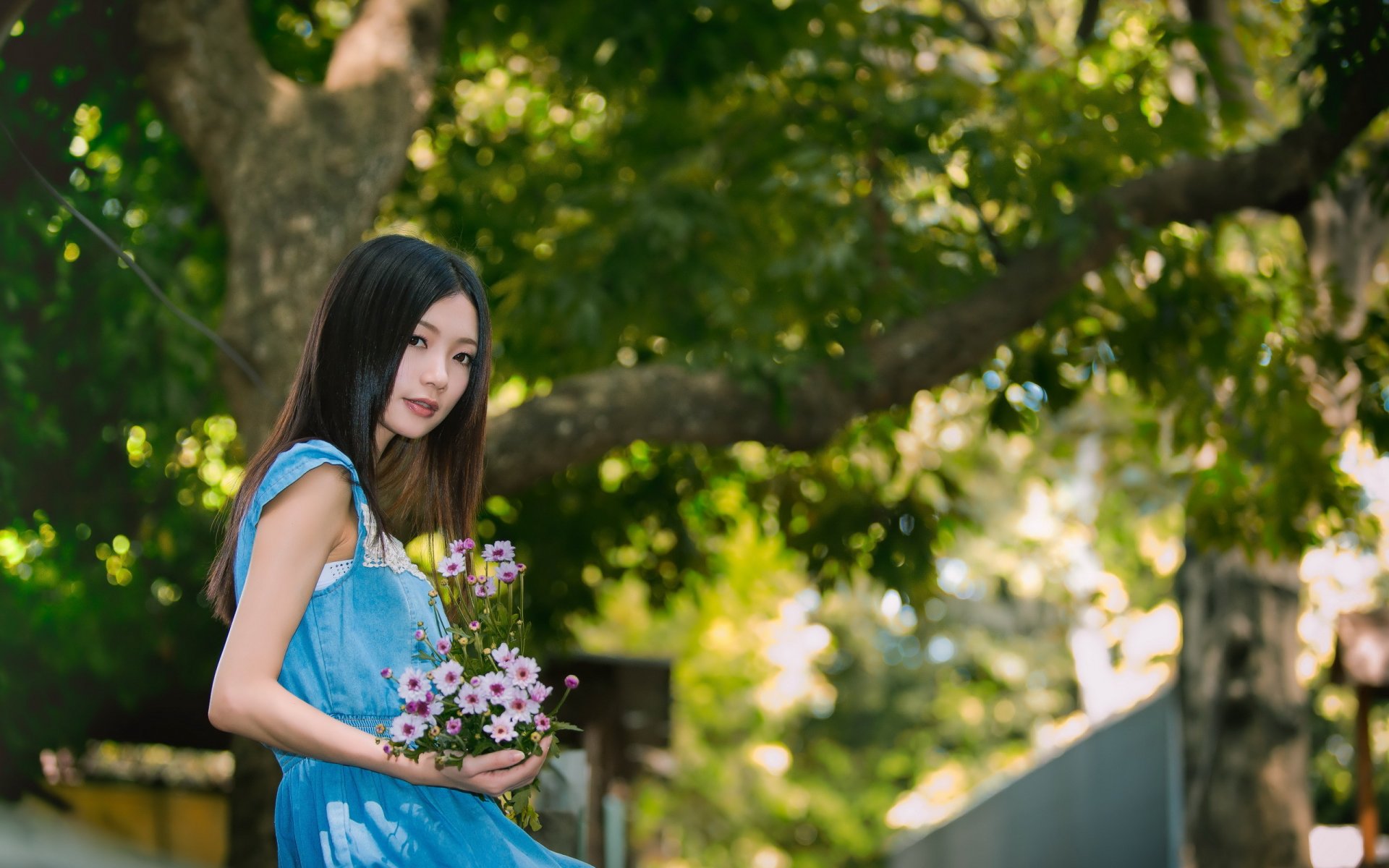 Fille avec des fleurs journée ensoleillée - fond d'écran de bureau