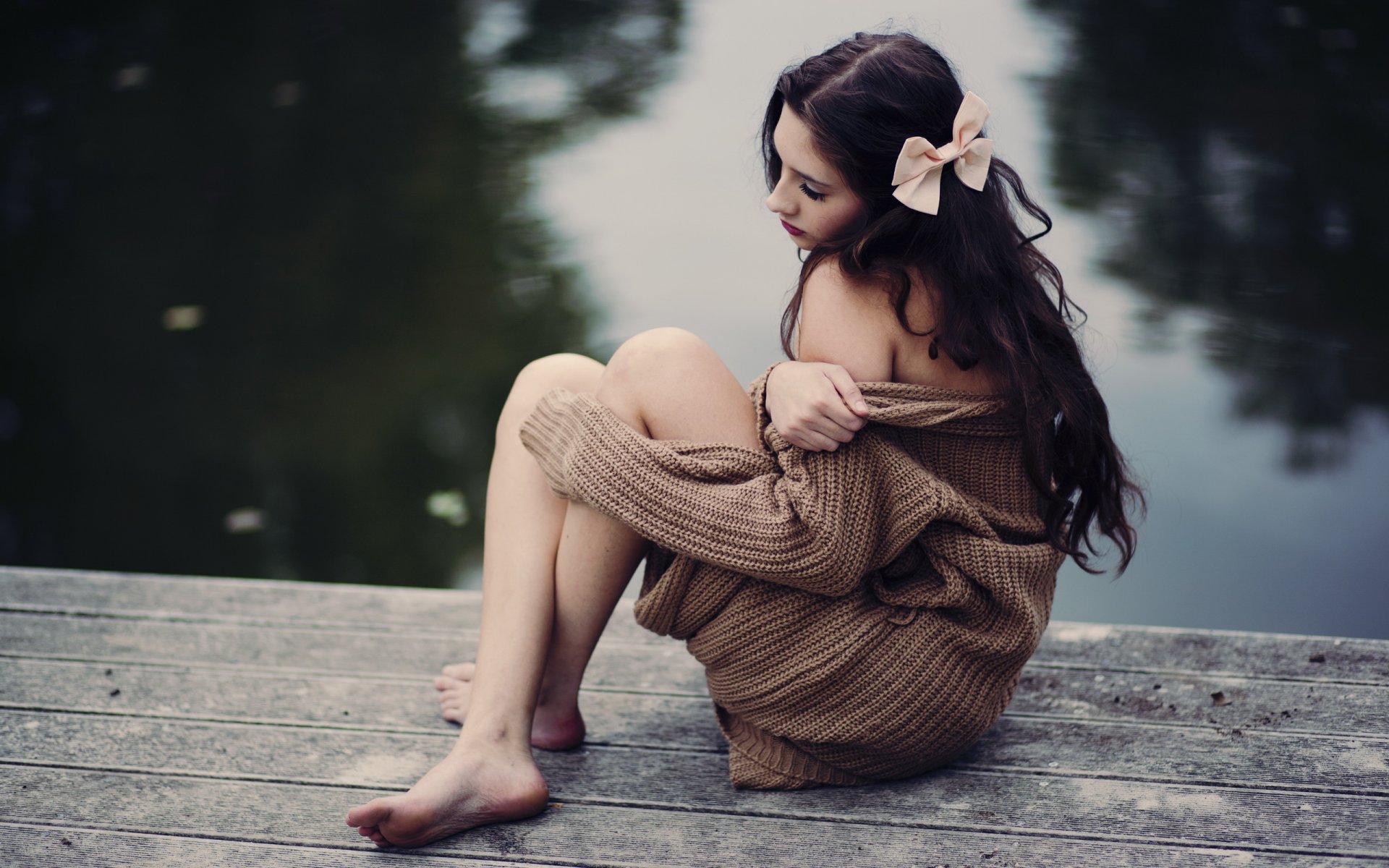 Fille avec un arc sur le pont au bord du lac - fond d'écran de bureau