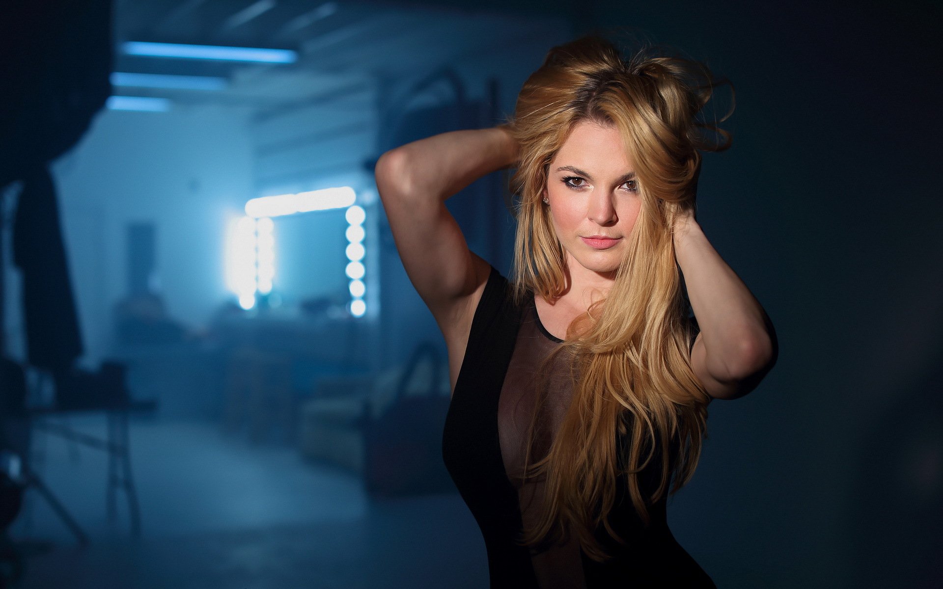 Fille blonde sexy posant dans une robe noire - fond d'écran de bureau