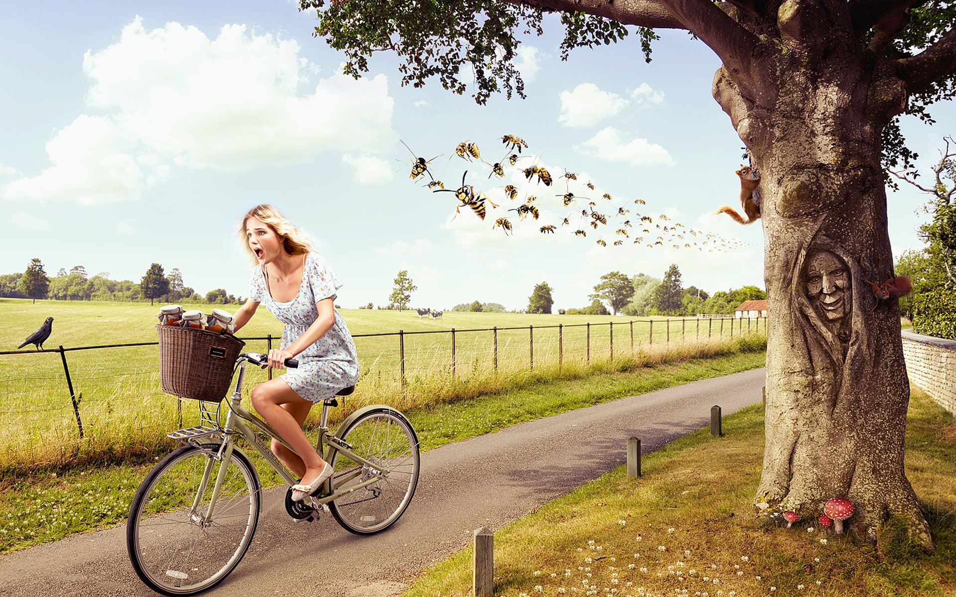 Tags:fille, grand, guêpes, essaim, arbre, sourire, écureuils