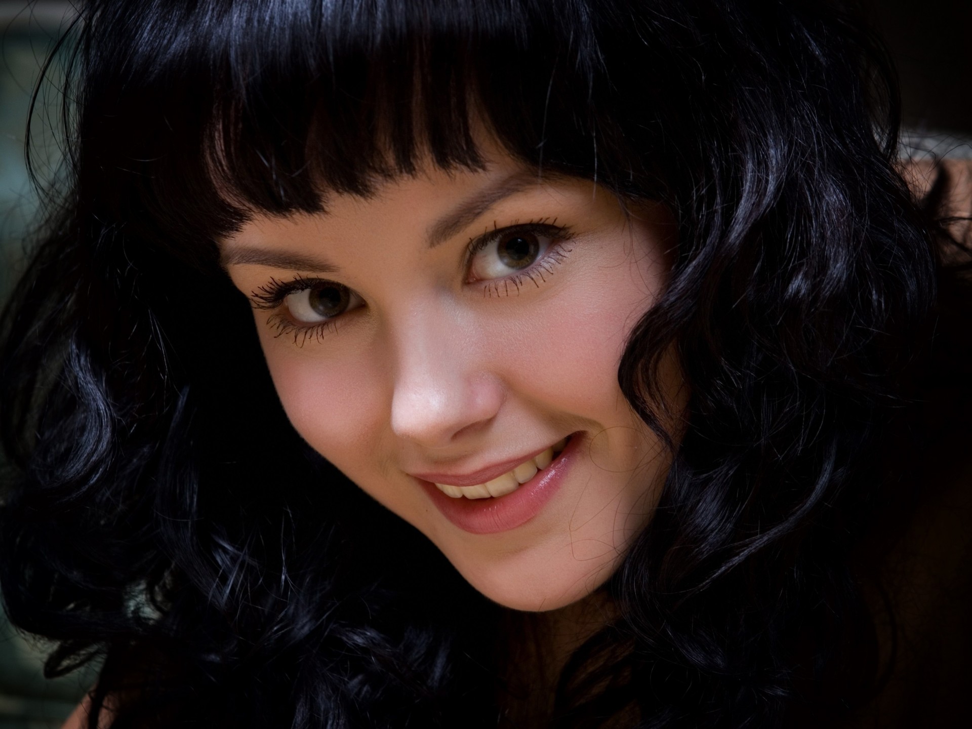Fille brune avec une frange souriante - fond d'écran de téléphone