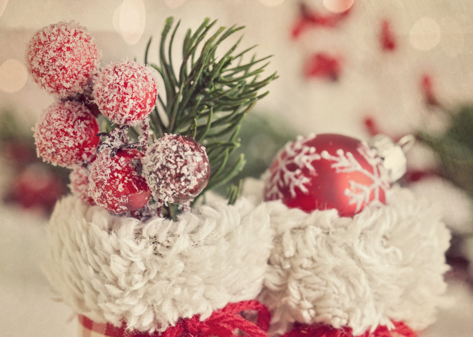 Bottes rouges et blanches pour Noël ornées de baies, de brindilles et de boules - fond d'écran de bureau