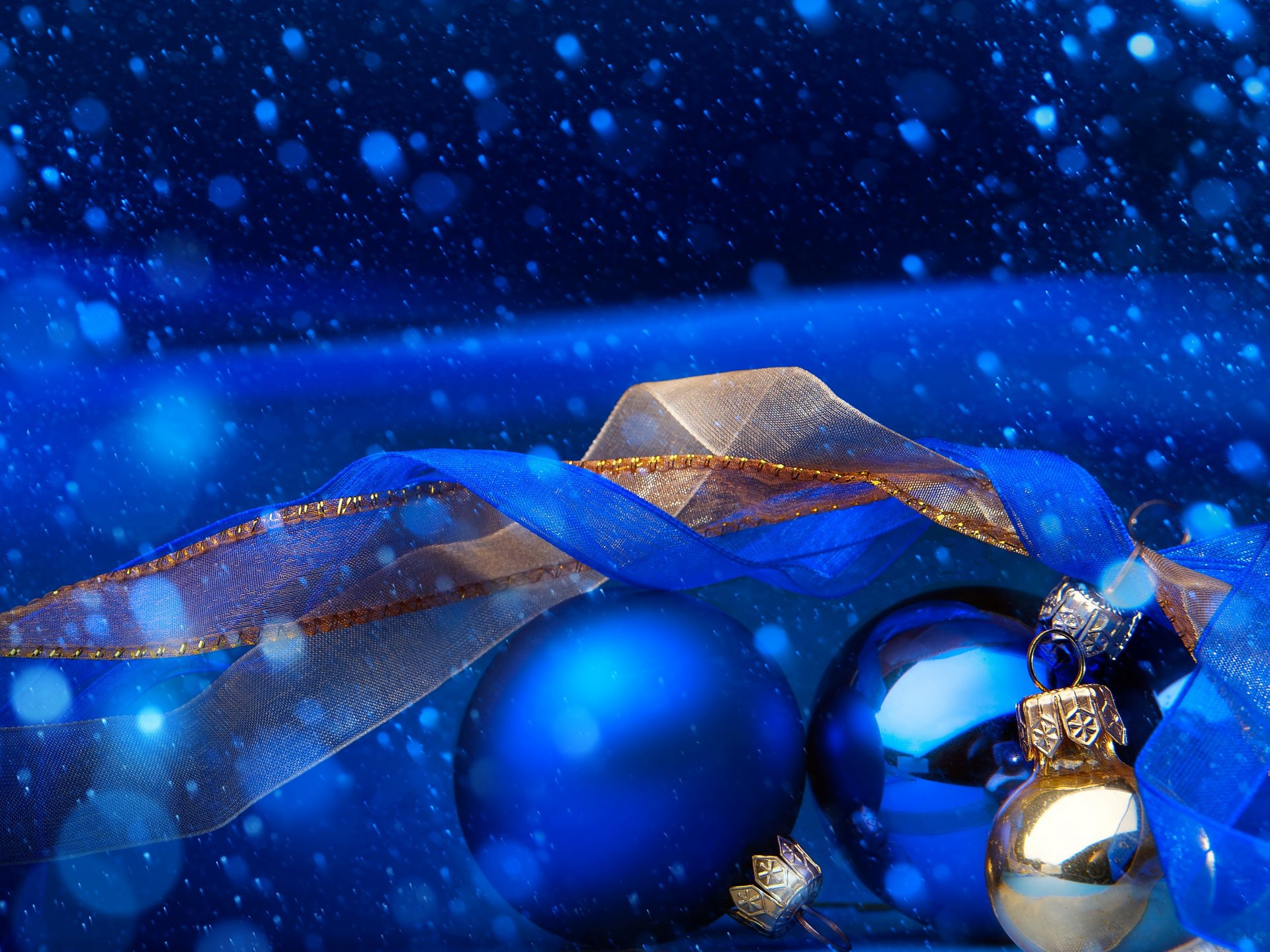 Boules dorées et bleues avec des rubans - fond d'écran de bureau