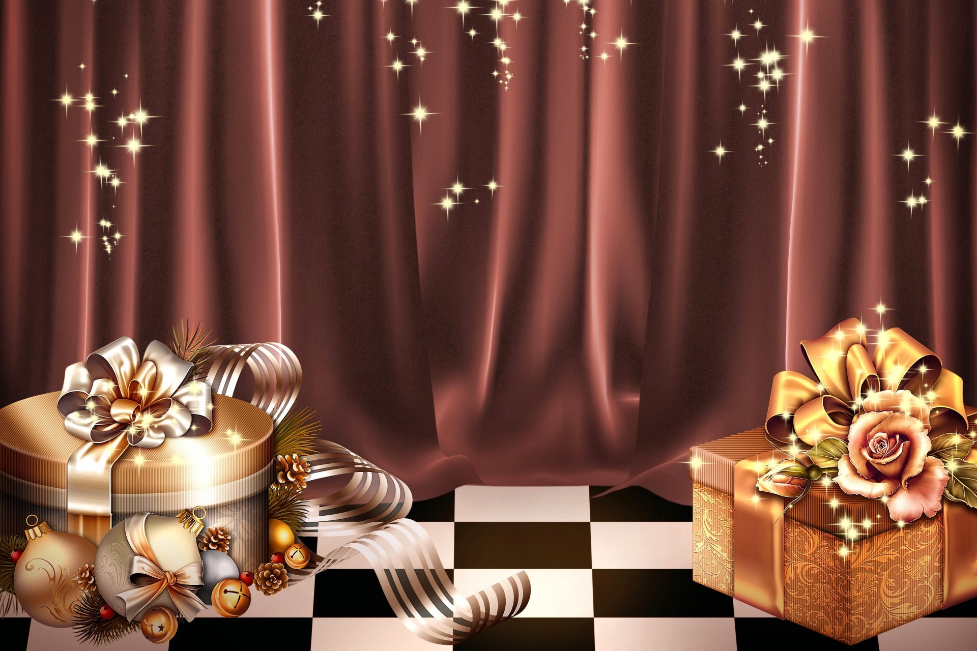 Cadeaux de Noël, boules de décoration - fond d'écran de bureau