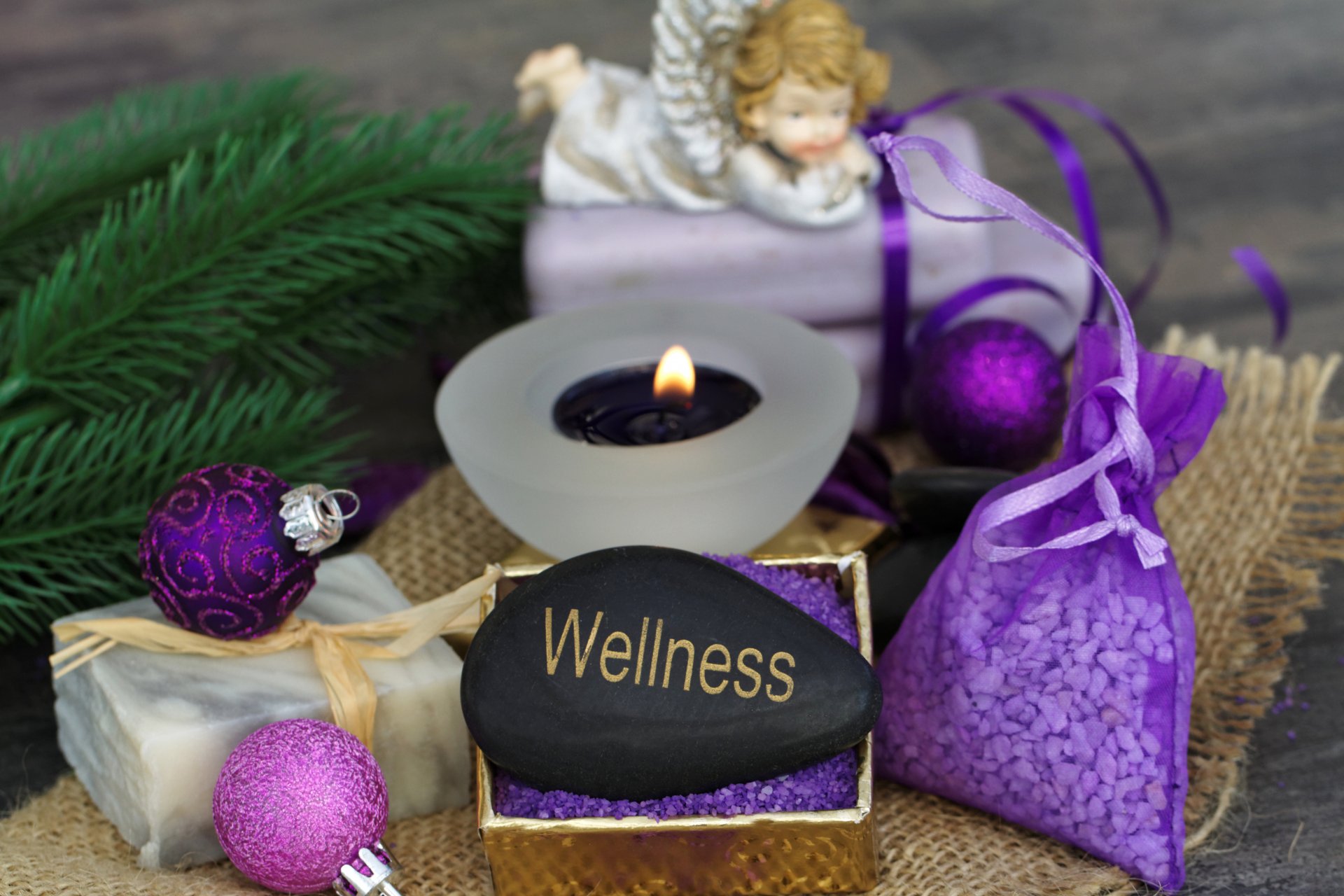 Pierre de massage sur fond de branche de sapin, ange et boules de Noël - fond d'écran de téléphone