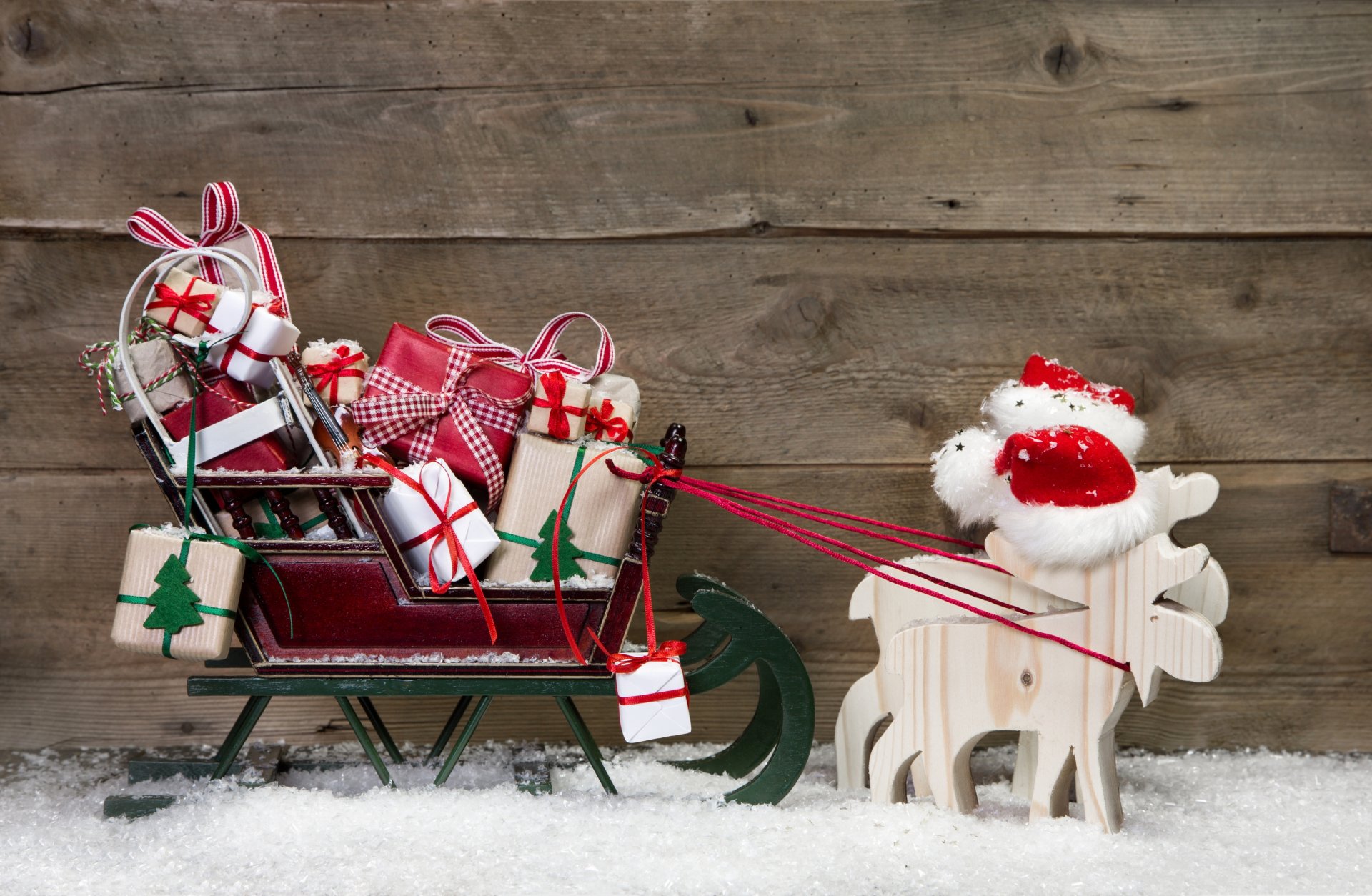 Rennes en bois et traîneau avec des cadeaux - fond d'écran de téléphone