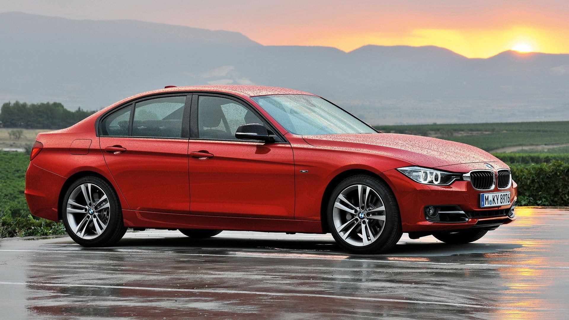 Bmw rouge, Berline sur asphalte mouillé - fond d'écran de bureau