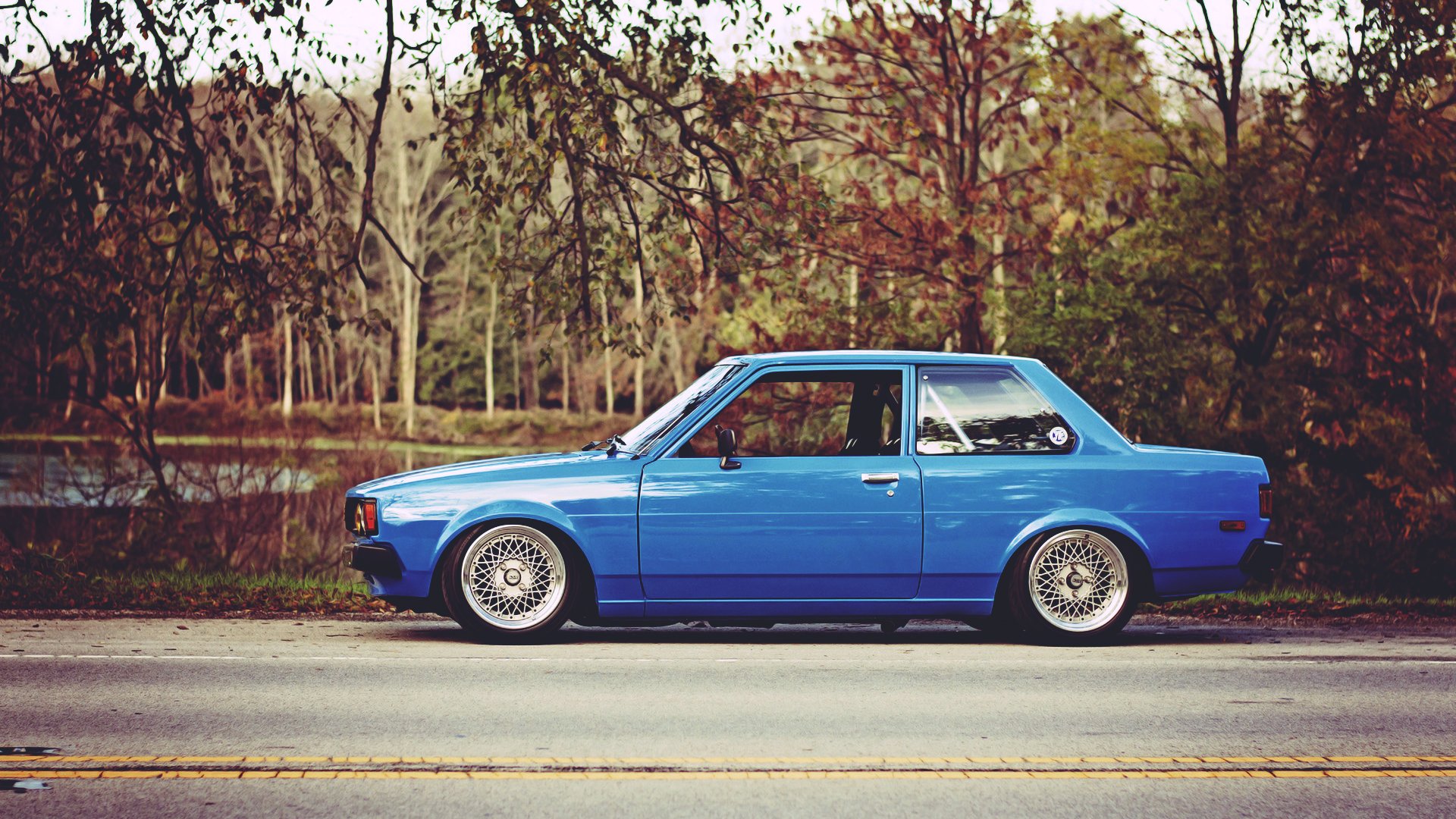 Une Toyota bleue se tient sur le bord de la route - fond d'écran de bureau
