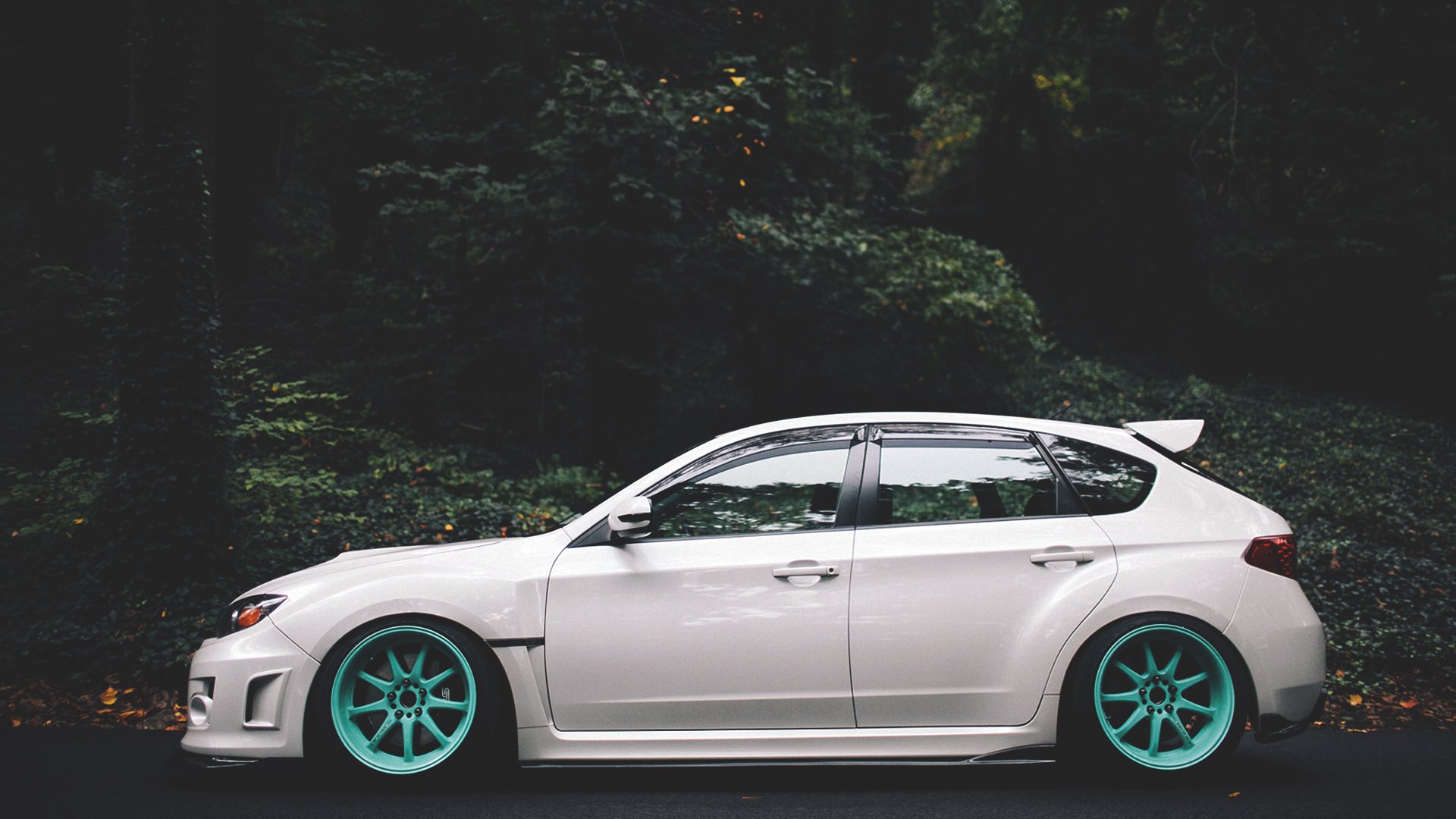 Subaru Impreza blanc parmi les arbres - fond d'écran de téléphone