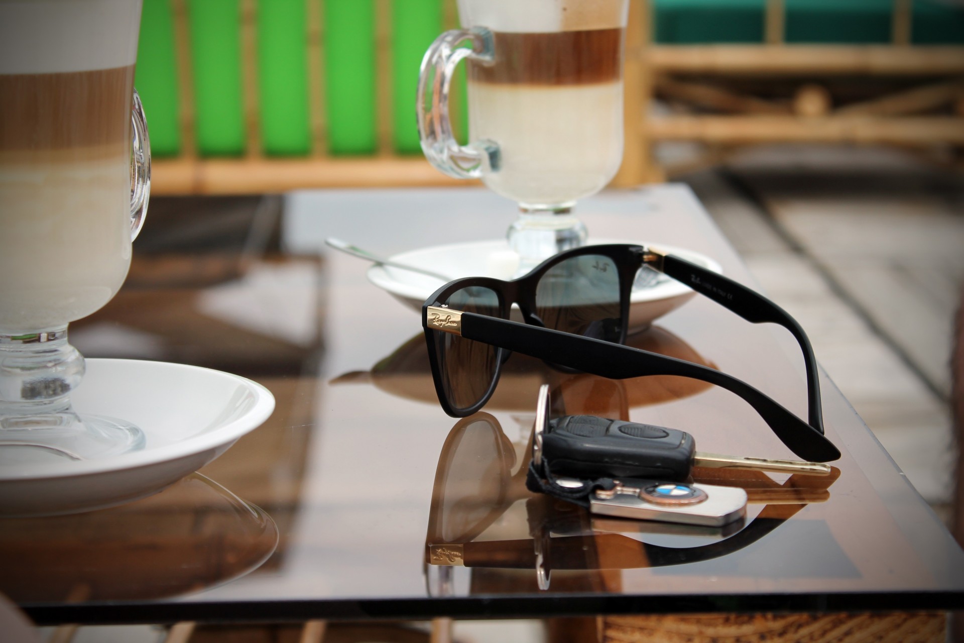 Table sur laquelle se trouvent des tasses, des lunettes et des clés avec un porte-clés BMW - fond d'écran de téléphone