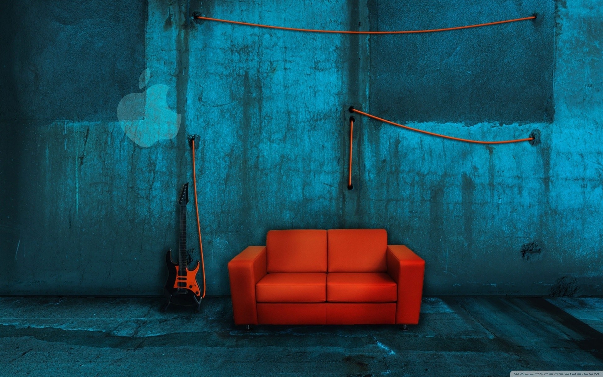 Canapé rouge, guitare et pomme sur fond bleu - fond d'écran de bureau