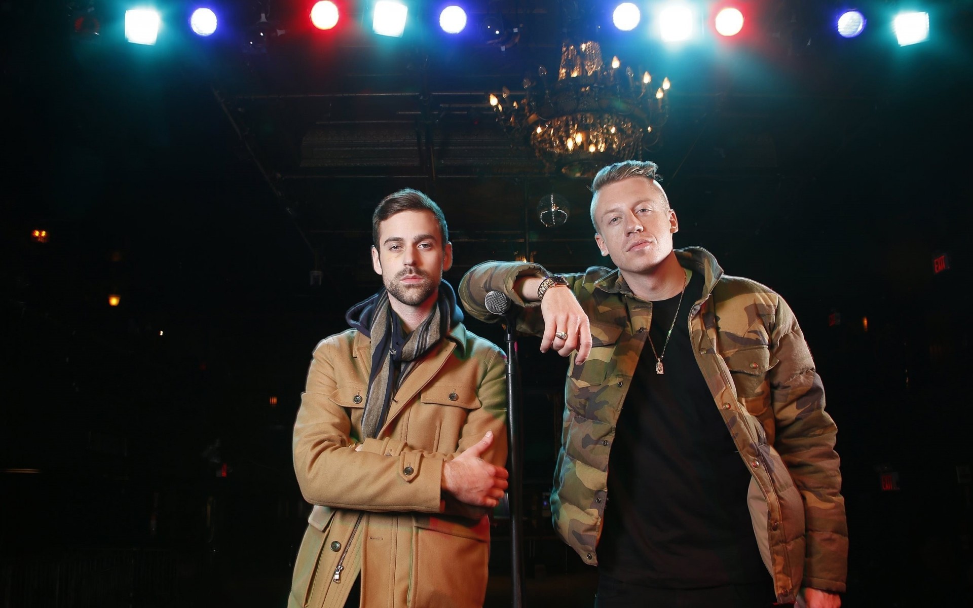 Deux acteurs sur scène avec un micro - fond d'écran de bureau