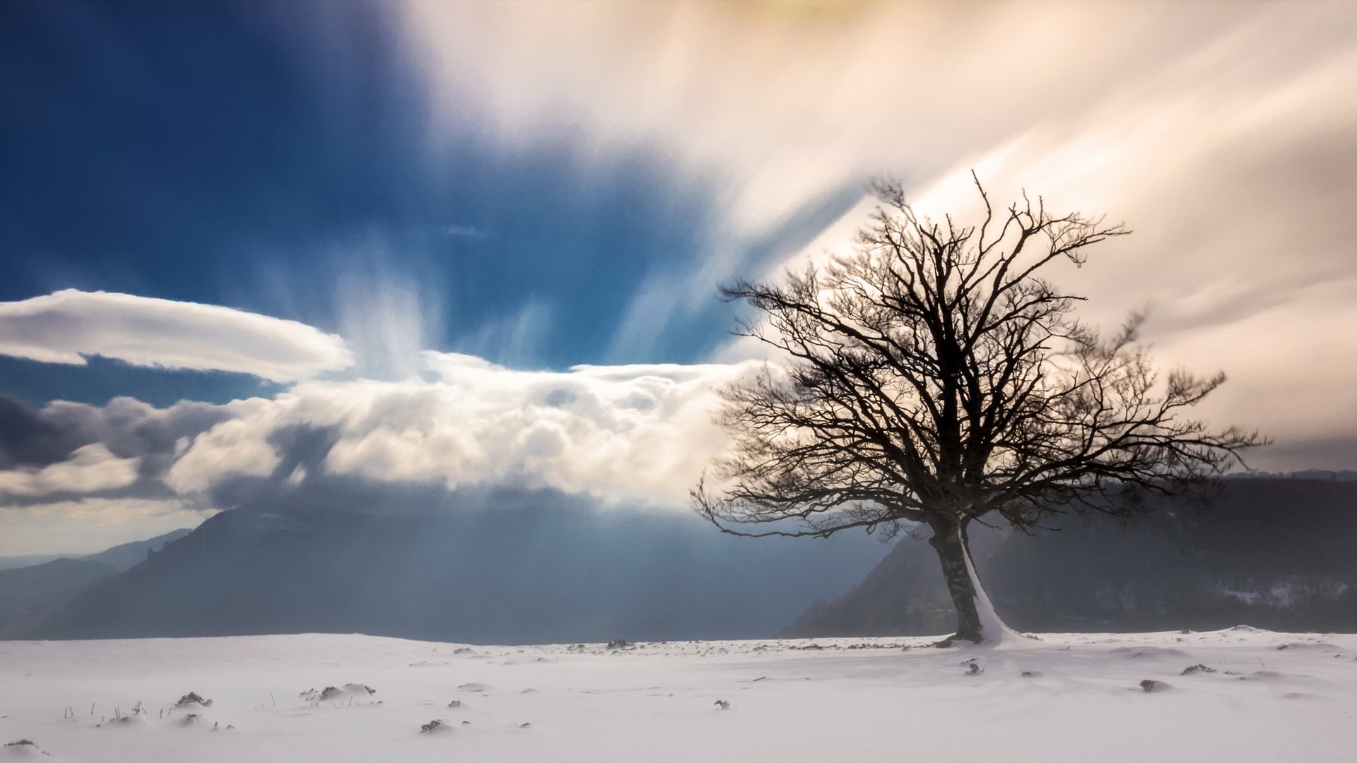 Arbre dans la neige et dans le brouillard - fond d'écran de bureau