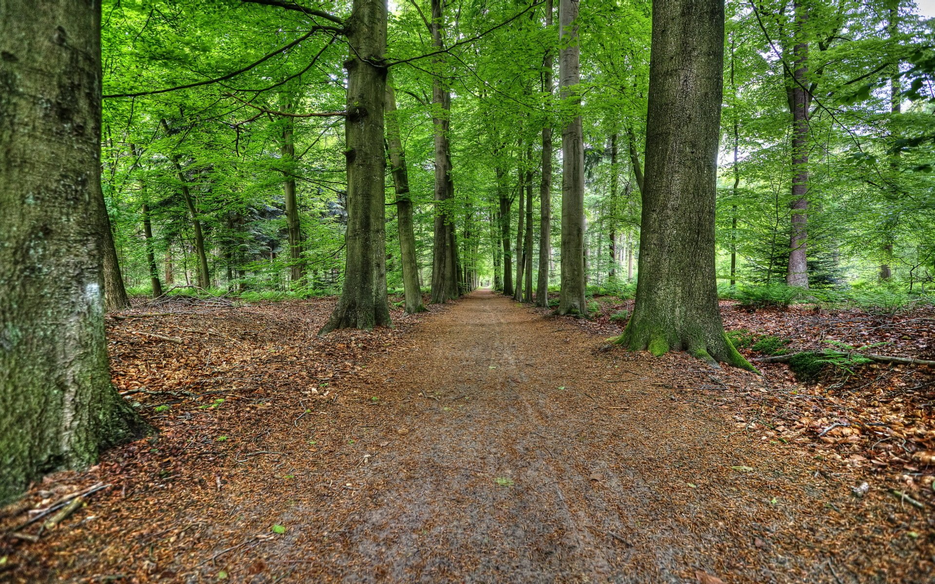 Arbres verts et route couverte de feuillage - fond d'écran de bureau