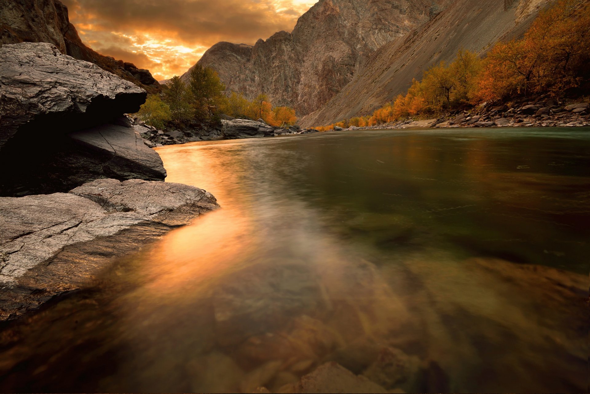 Côte rocheuse d une rivière de montagne - fond d'écran de bureau