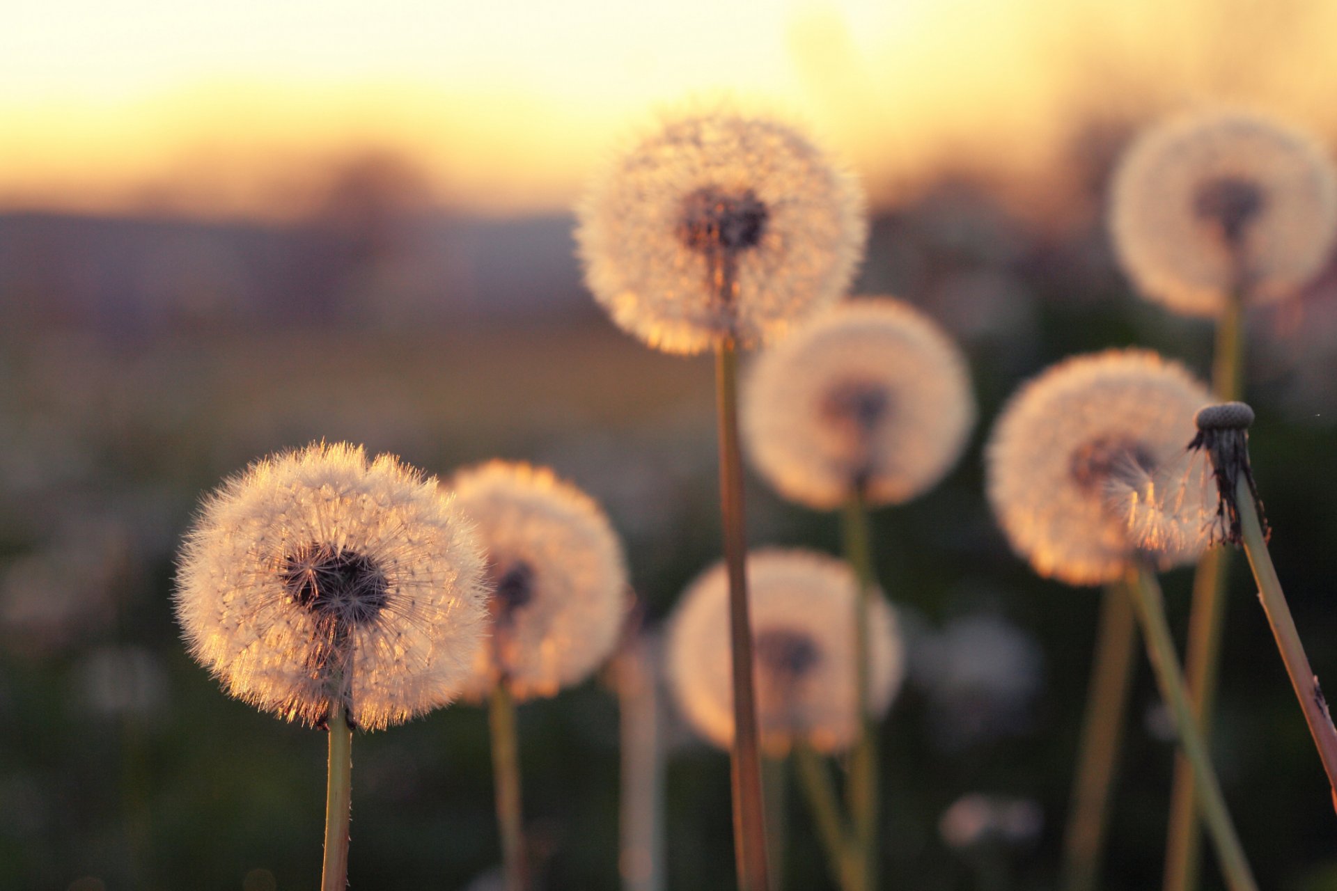 Coucher de soleil sur le terrain avec des pissenlits blancs - fond d'écran de bureau
