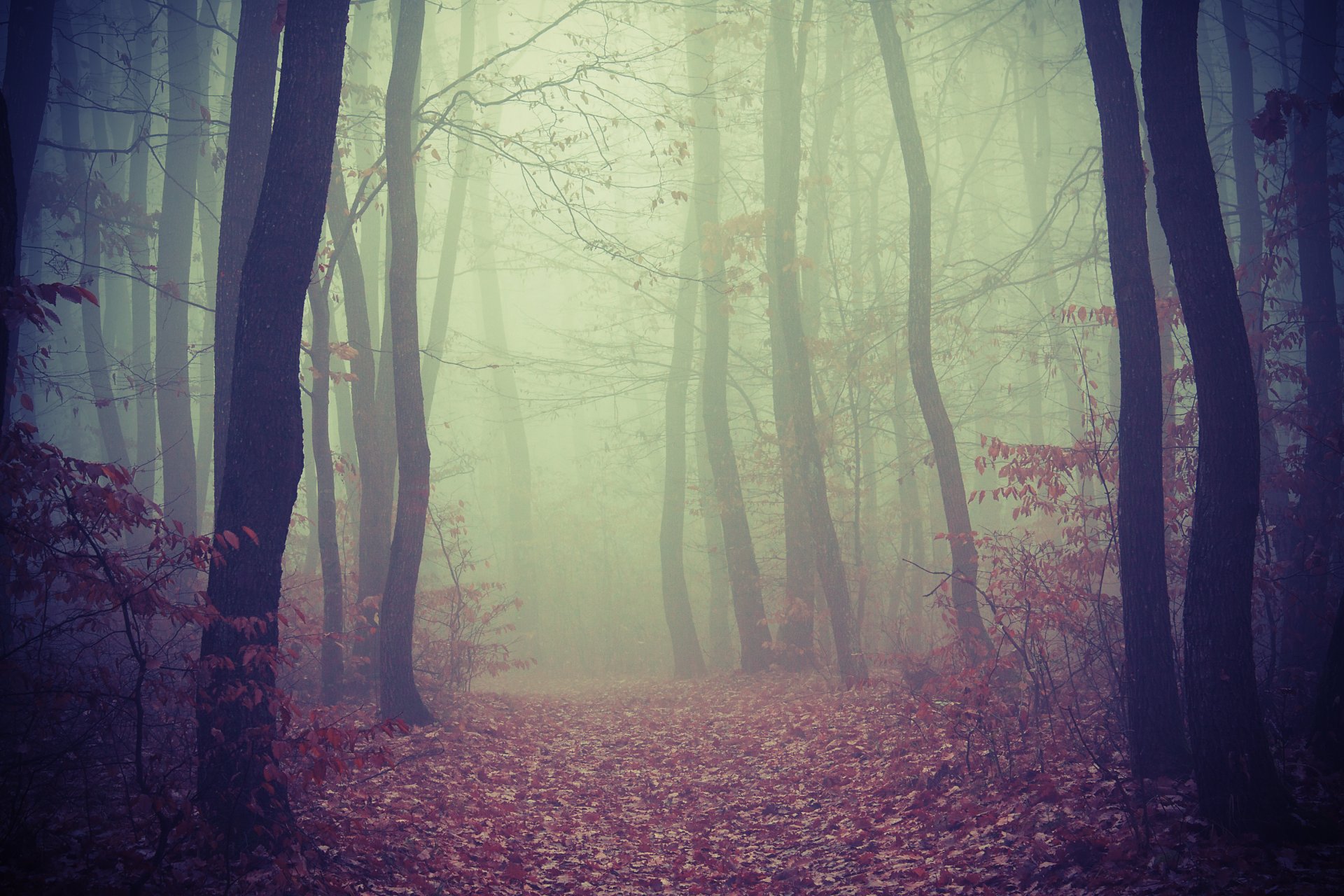 Forêt brumeuse avec vaib d automne - fond d'écran de bureau