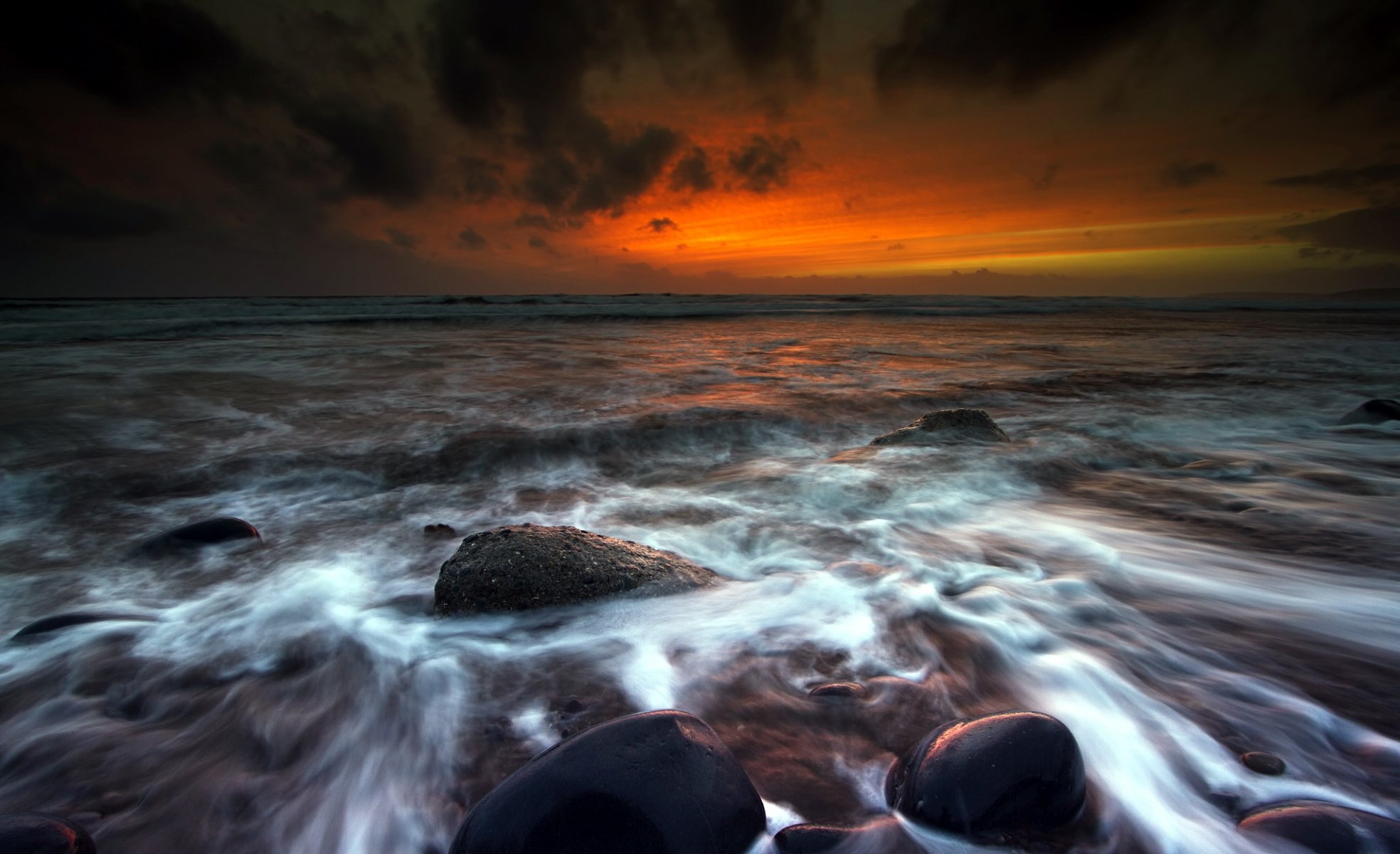 L eau lave les pierres au coucher du soleil - fond d'écran de bureau