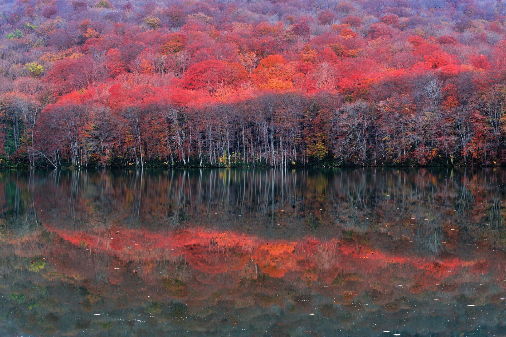 Tags:pente, forêt, lac, arbres, réflexion, automne, pourpre