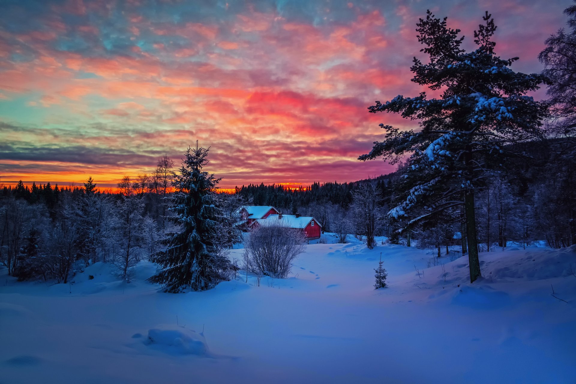 hiver soir coucher de soleil ciel nuages peinture neige forêt maison
