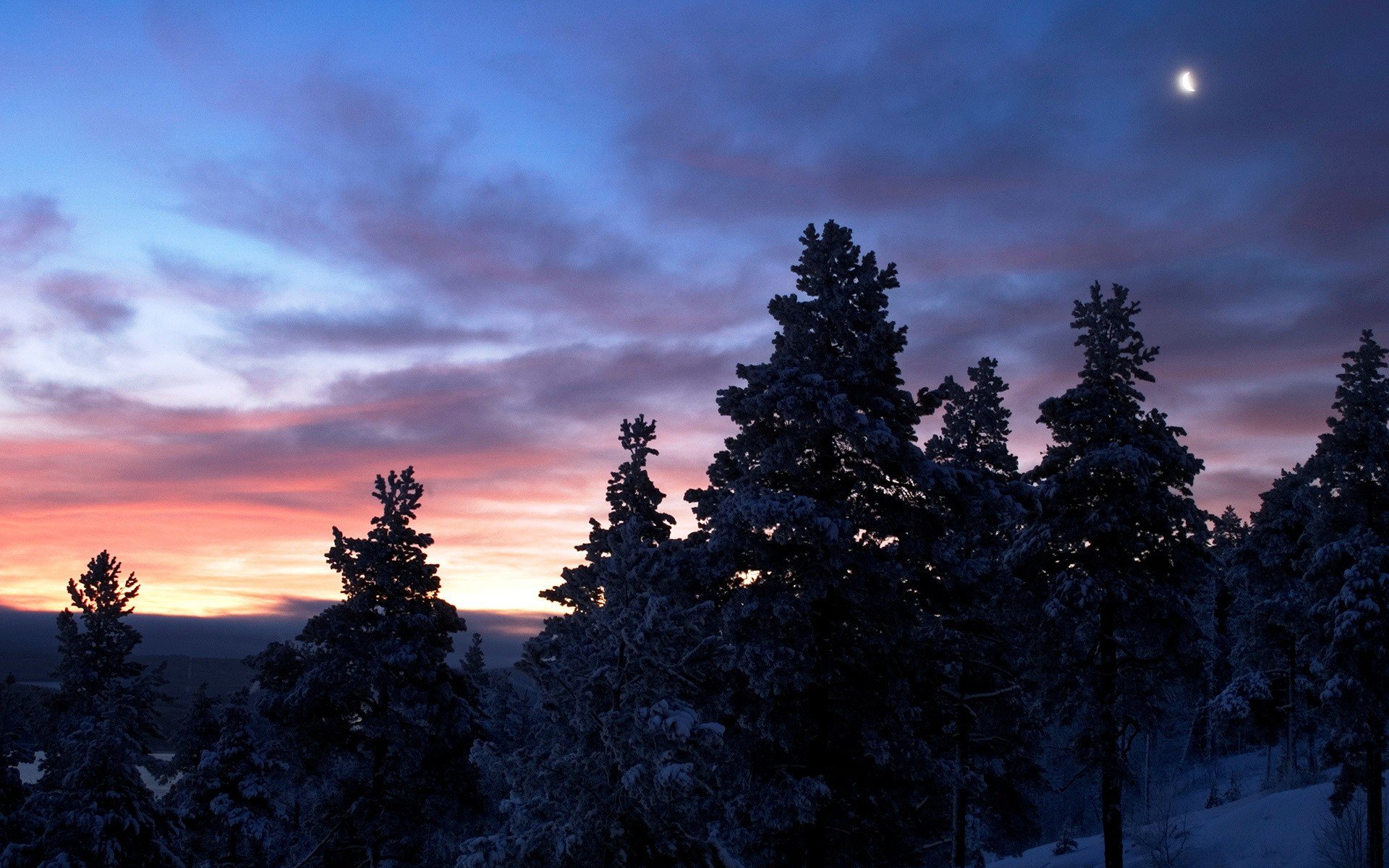 Arbres coucher de soleil hiver neige - fond d'écran de téléphone