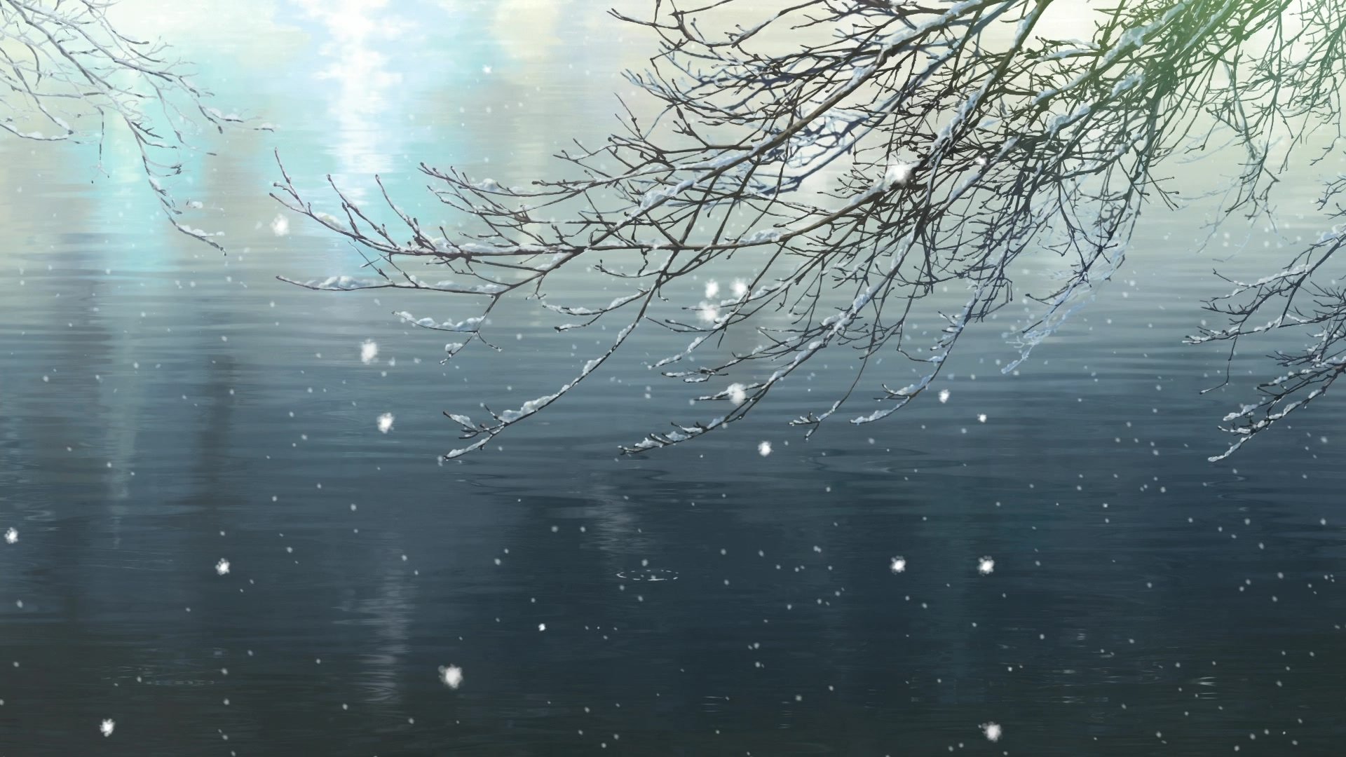 Tags:jardin de mots gracieux, makoto shinkai, étang, branche, neige, hiver, lumière