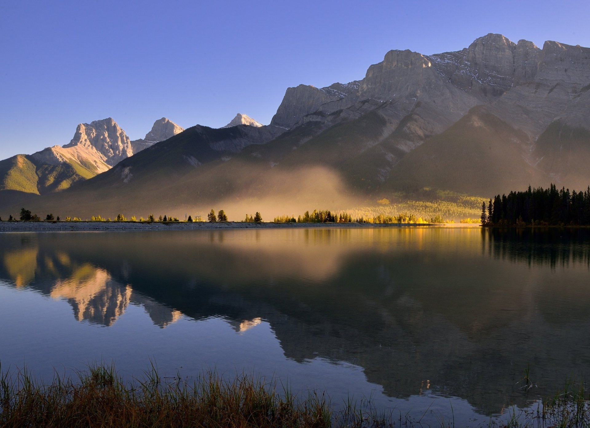 Tags:lac, montagnes, forêt, arbres, matin, brume