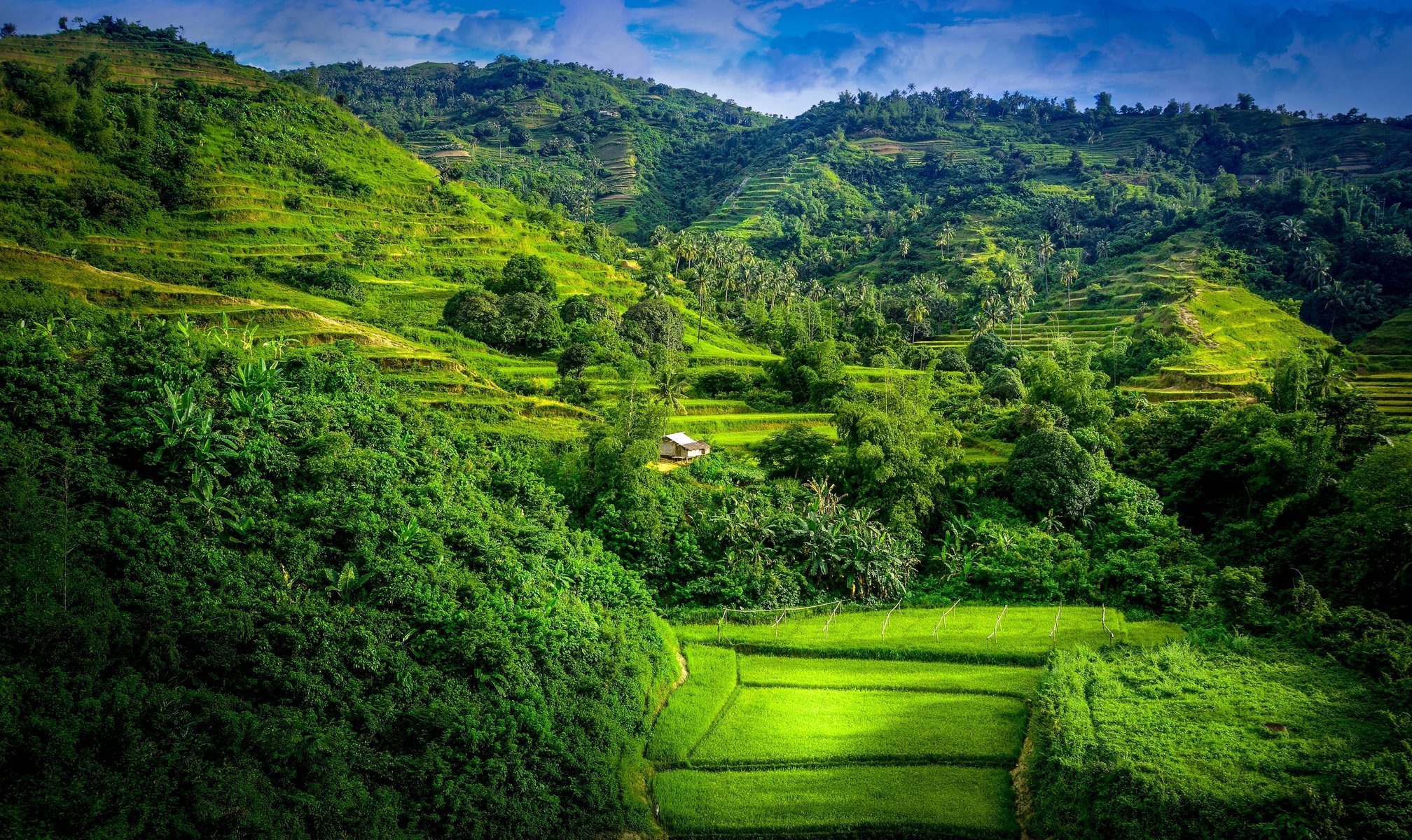Champs dans les montagnes et une petite maison - fond d'écran de téléphone