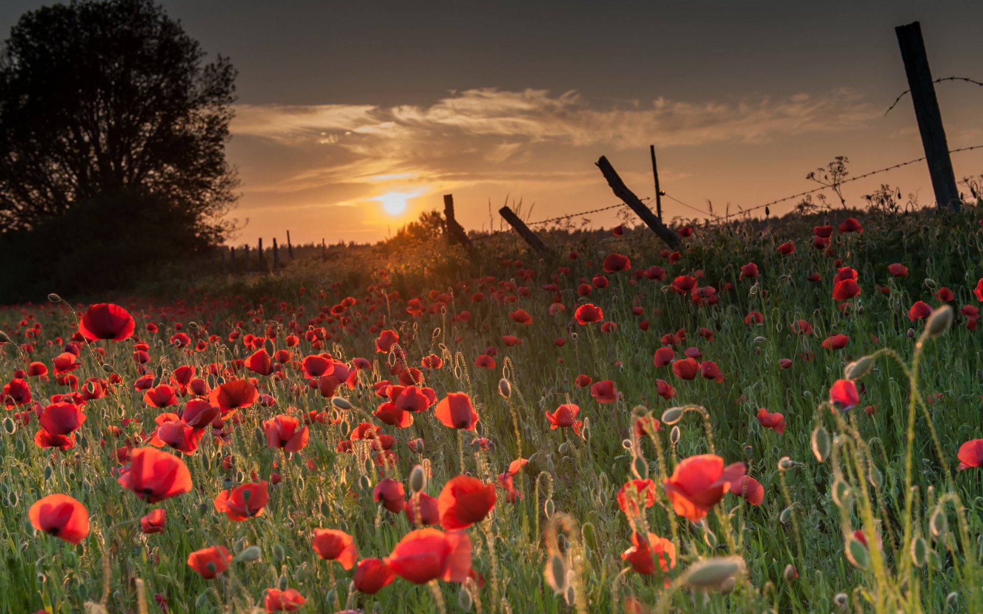 Tags:coucher de soleil, coquelicots, champ, clôture, nature