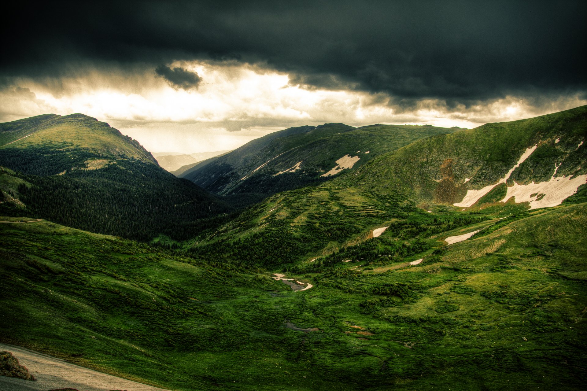Tags:paysage, nature, montagnes, collines, arbres, pré, vert, ciel, nuages