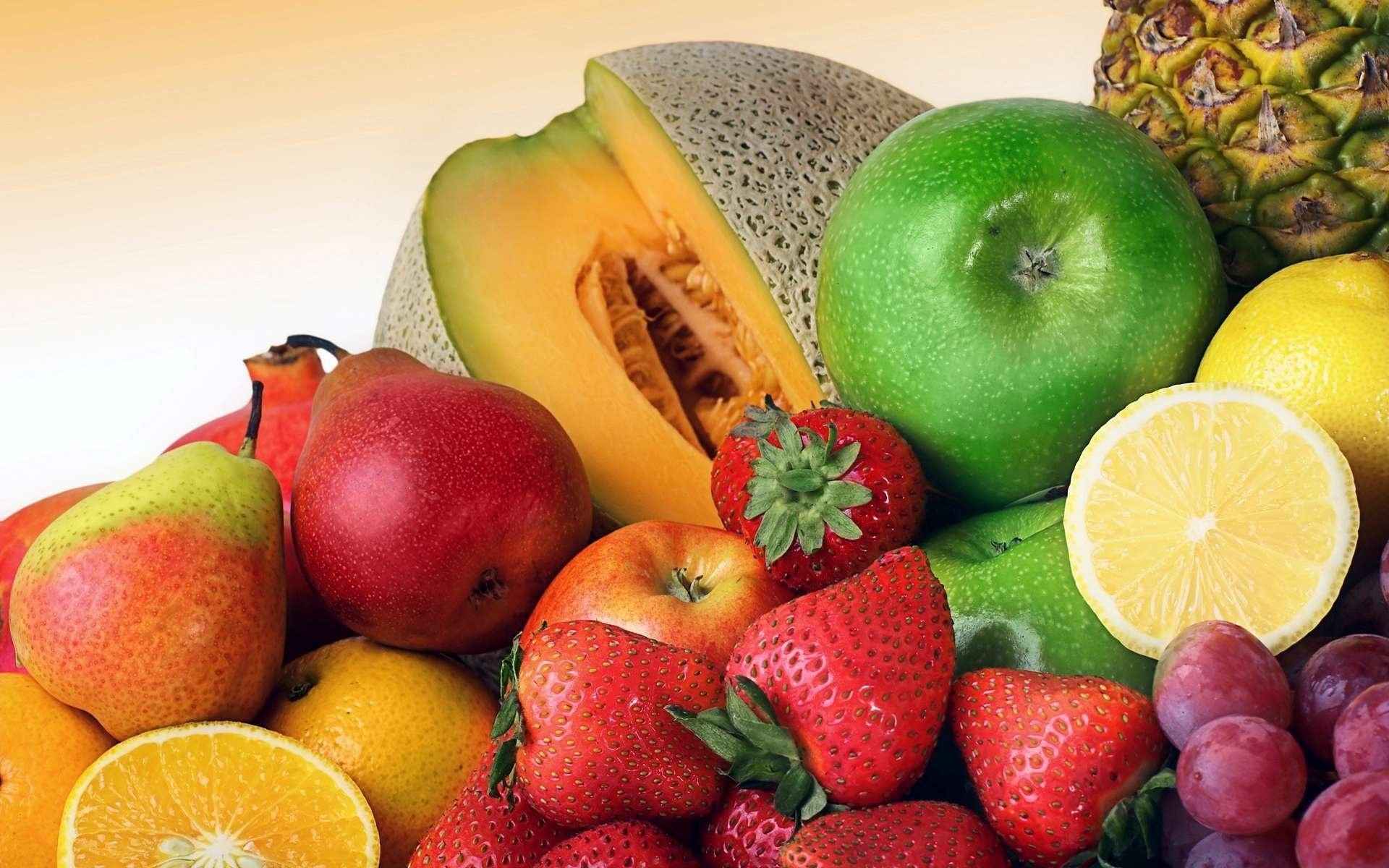 Assortiment de fruits: fraises, citron, raisins, poires, oranges, pommes, fruits de la passion - fond d'écran de bureau