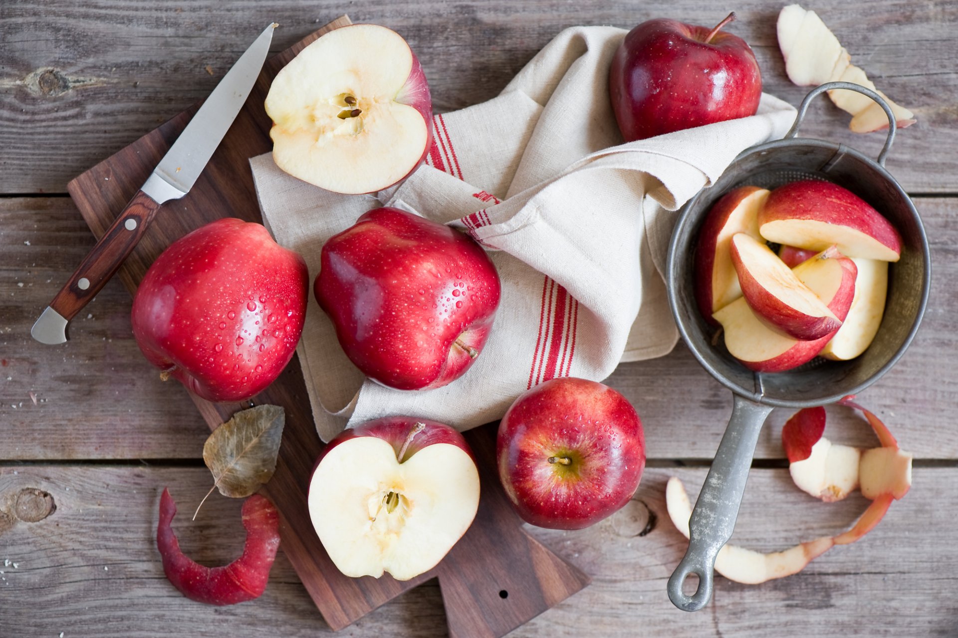 Pommes rouges mûres sur la table - fond d'écran de bureau