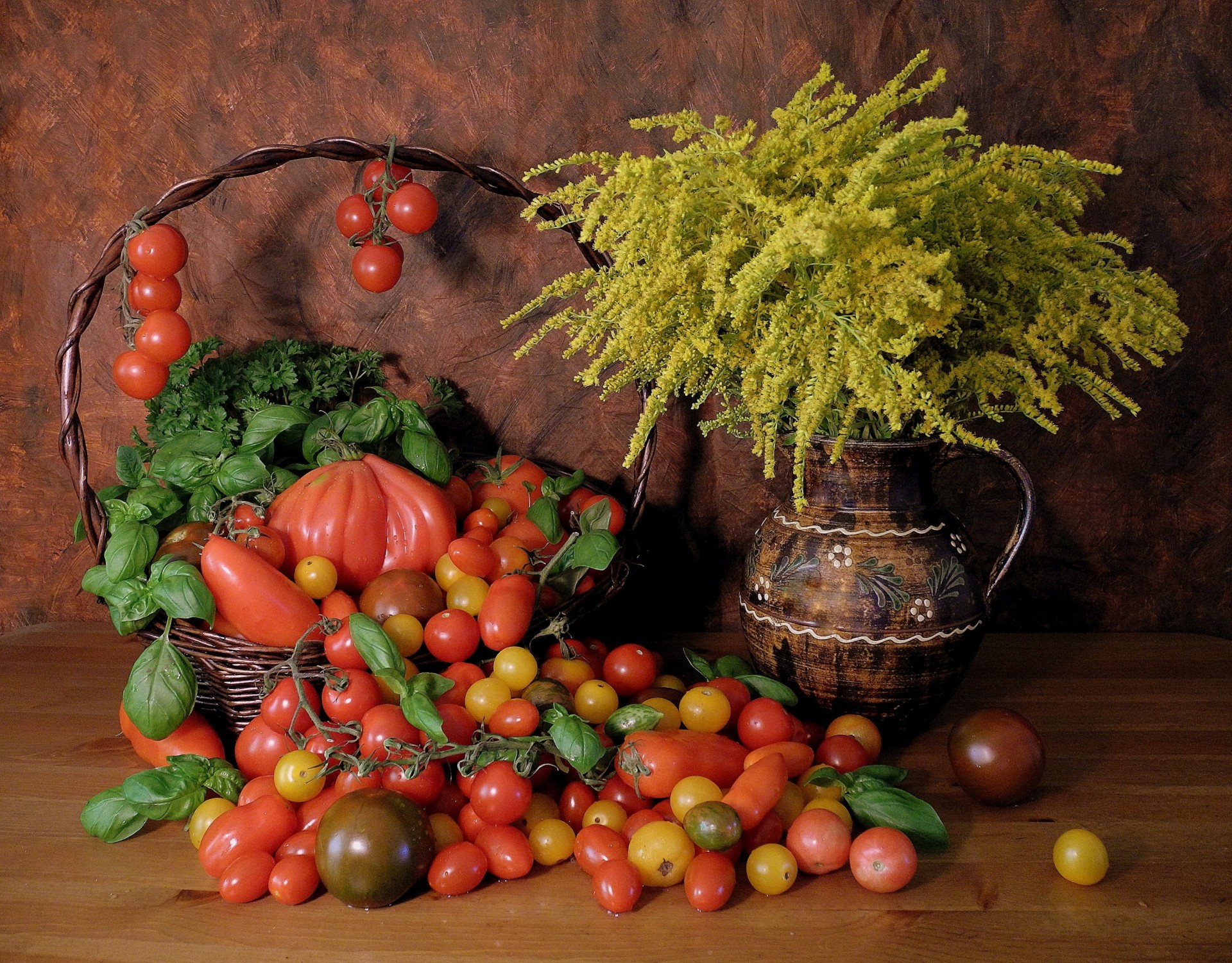Vase nature morte avec des fleurs et des tomates - fond d'écran de bureau