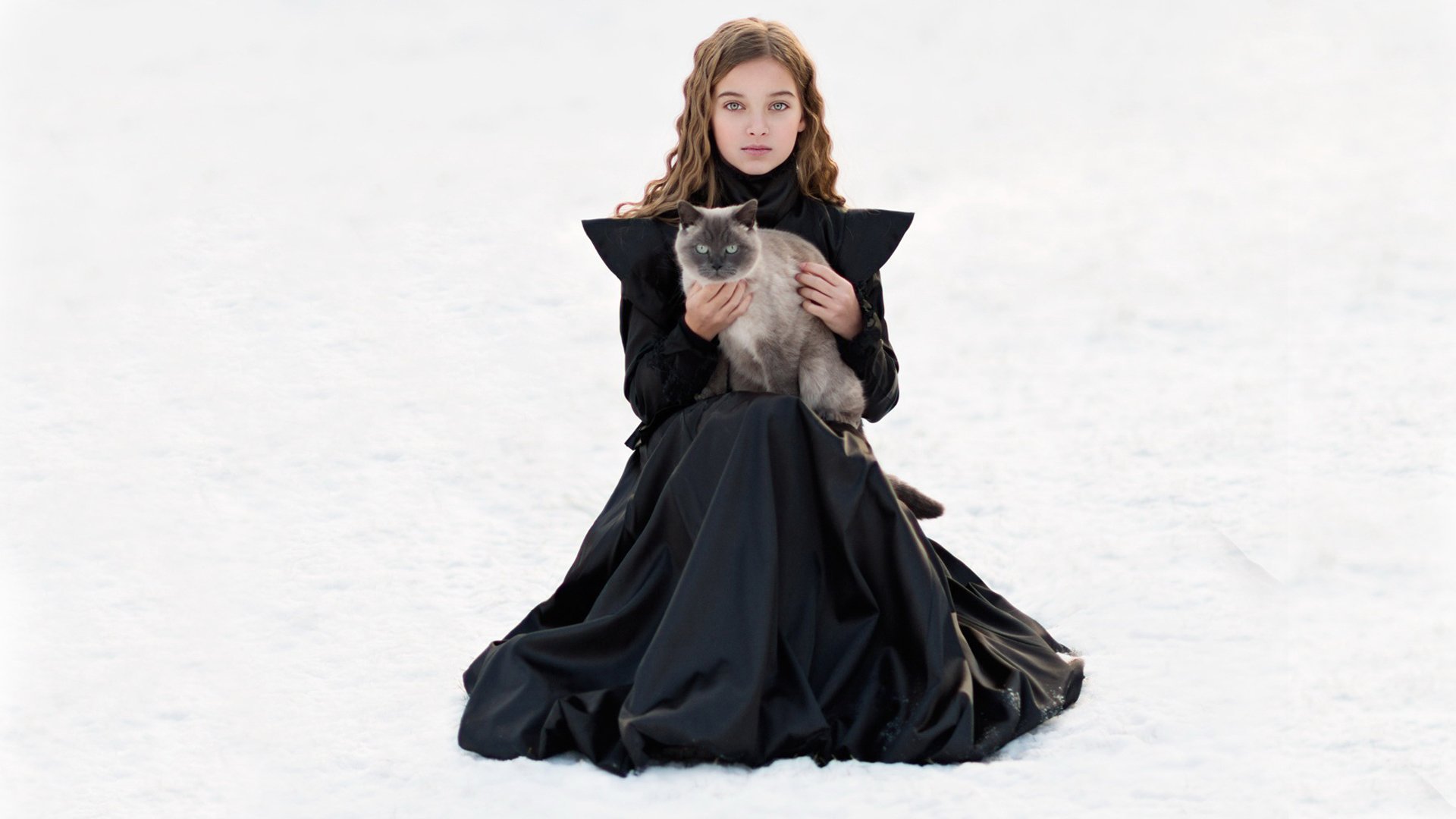 La photo de la fille sur la neige blanche un chat - fond d'écran de bureau