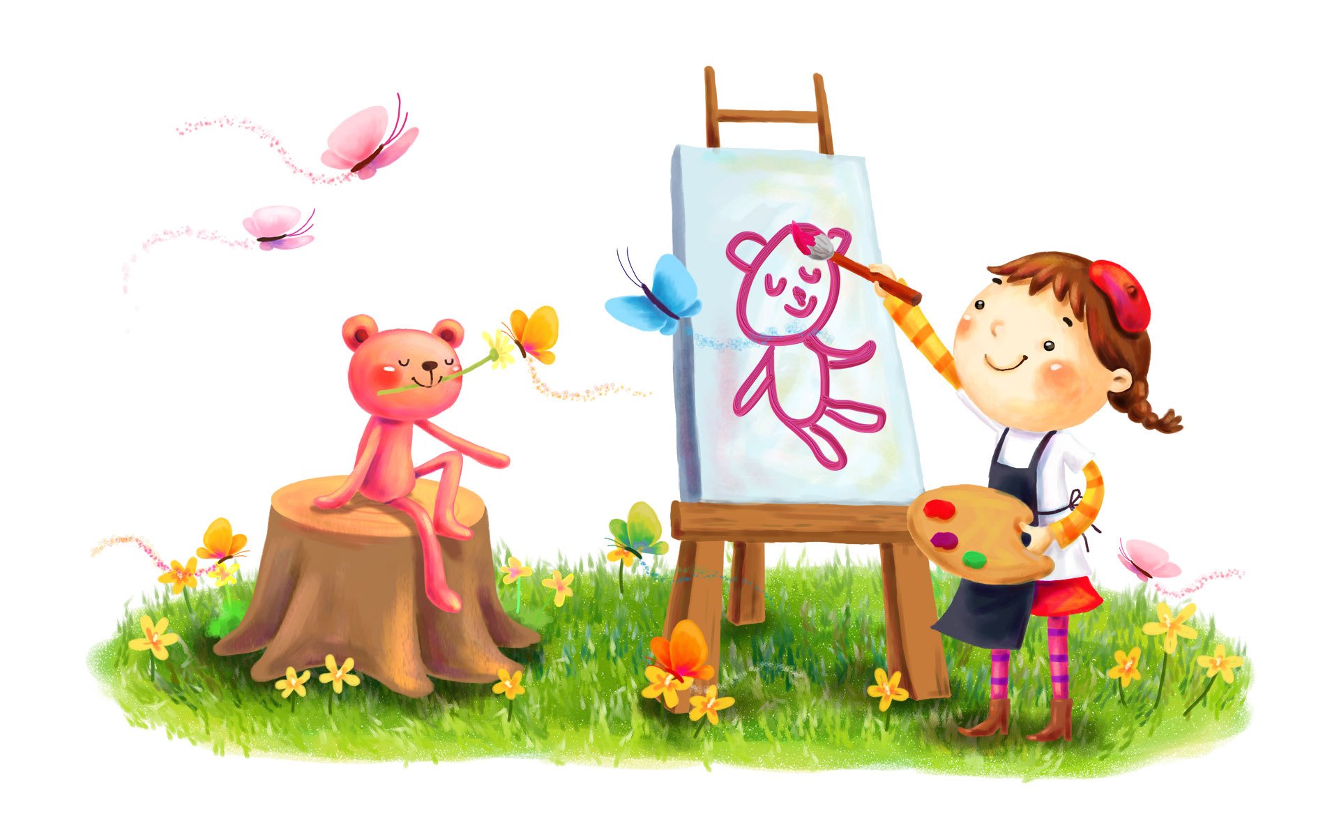 Tags:dessin, fille, sourire, dessin, peinture, brosse, papillons, pelouse, été, fleurs