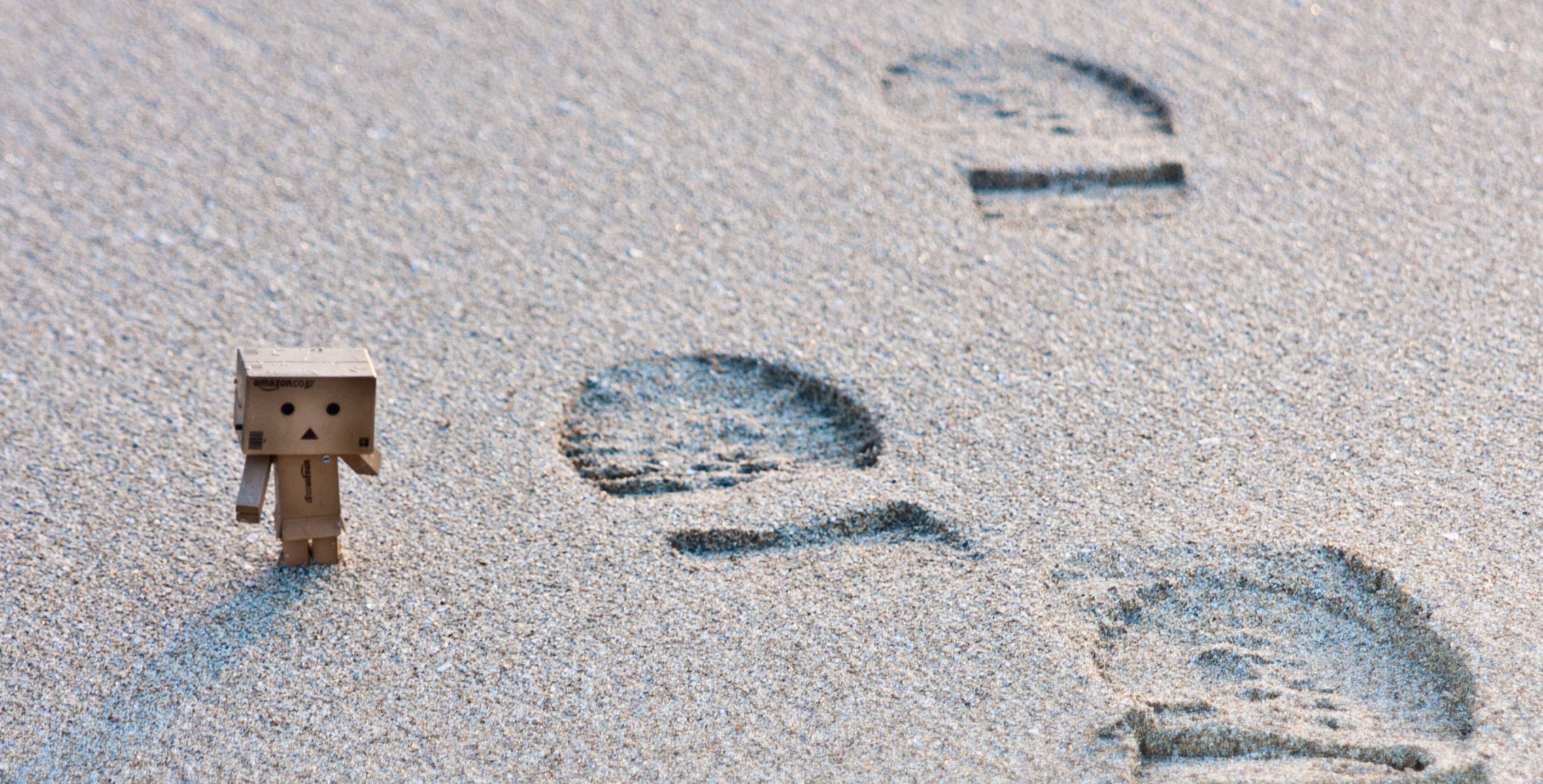 Danbo explore les traces sur le sable de la plage - fond d'écran de téléphone