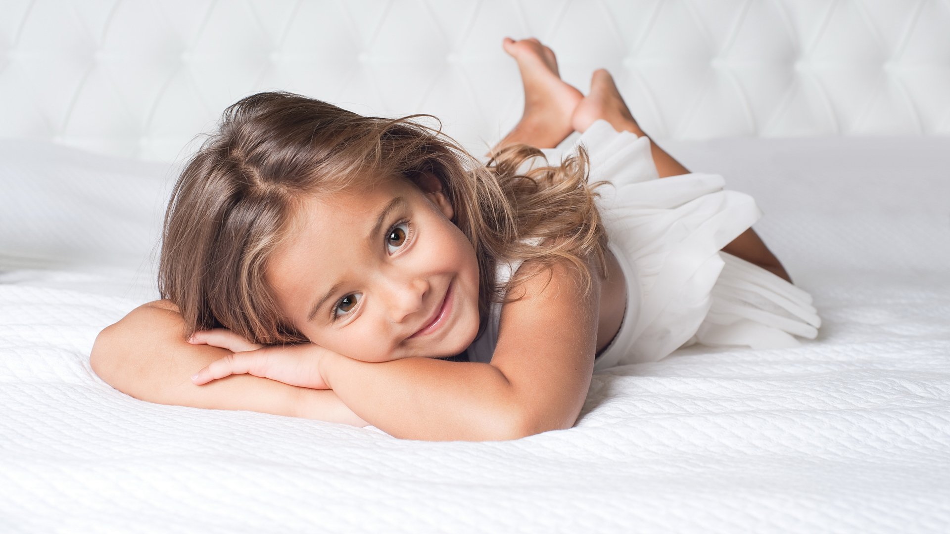 Enfant rayonnante sur un lit de luxe - fond d'écran de téléphone
