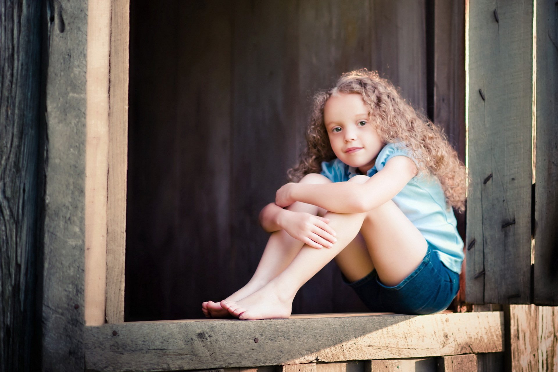 Fille aux cheveux bouclés est assis sur le porche - fond d'écran de téléphone