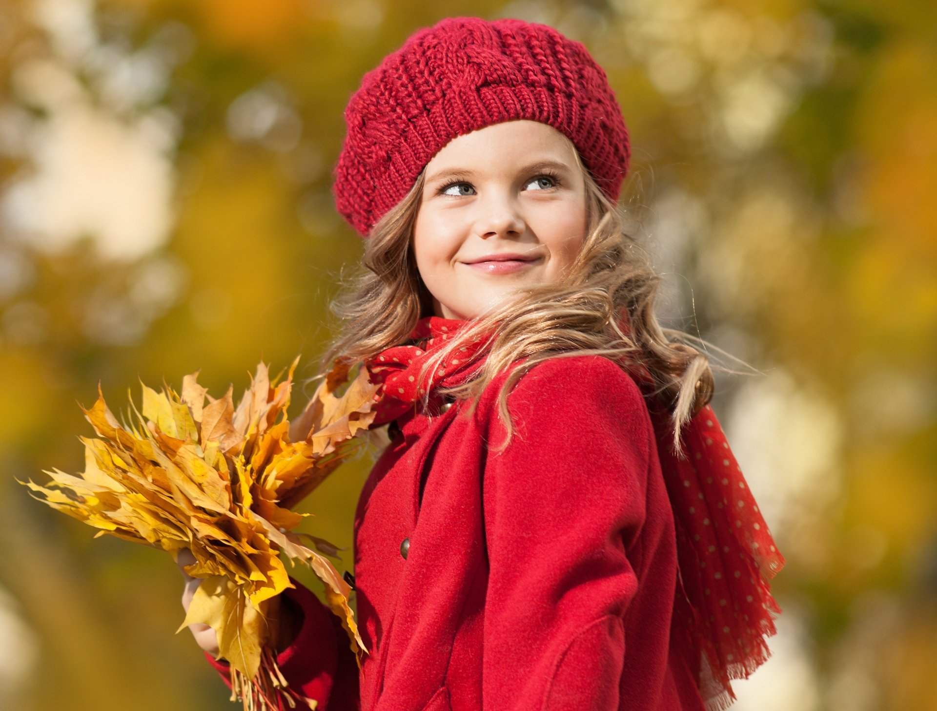 Fille en vêtements rouges et feuilles jaunes - fond d'écran de téléphone