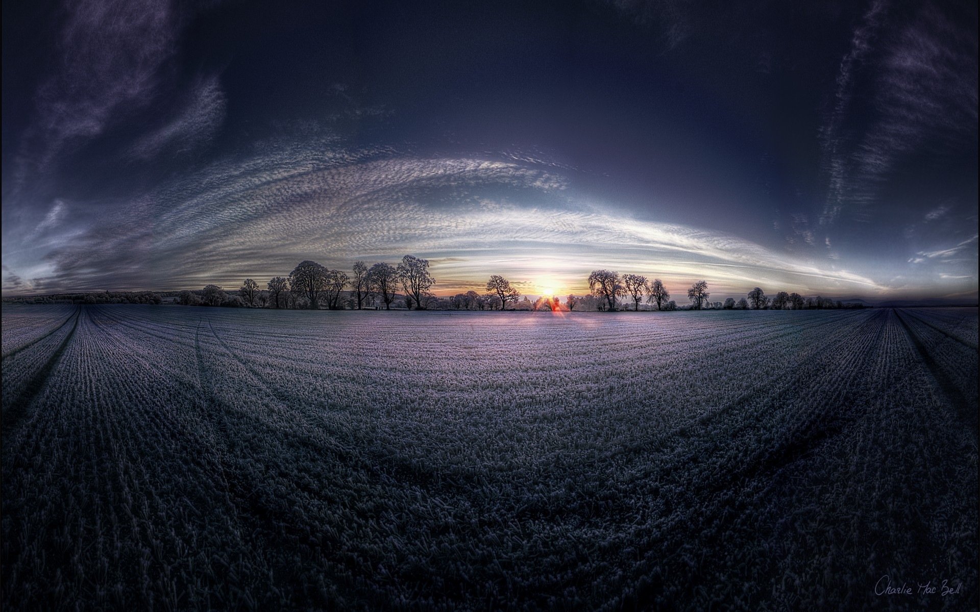 Aube sur un champ de lavande filmé à l œil de poisson - fond d'écran de bureau