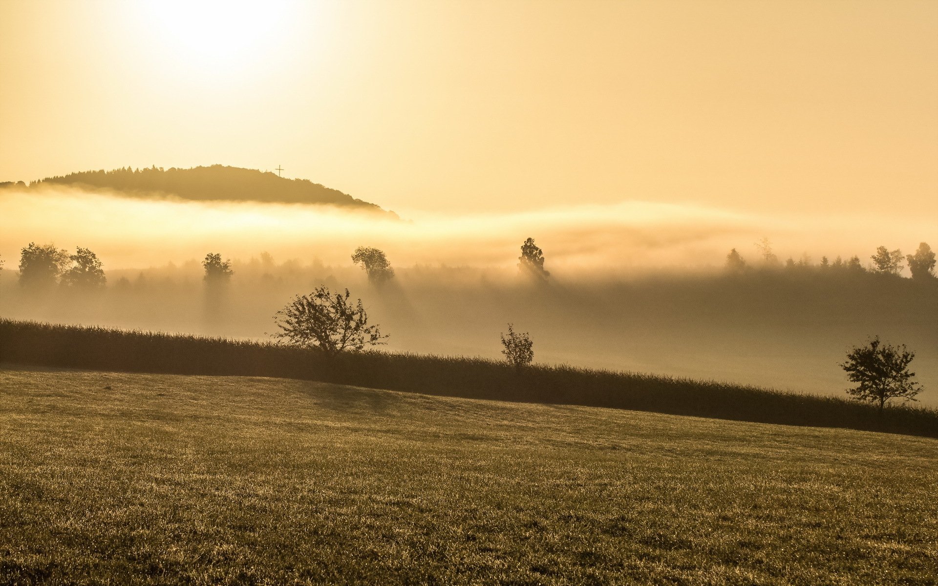 Brouillard du matin sur les montagnes et dans le champ - fond d'écran de bureau