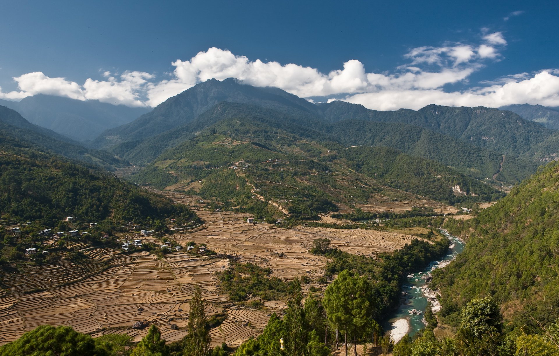 Champs et montagnes . vue de loin - fond d'écran de bureau