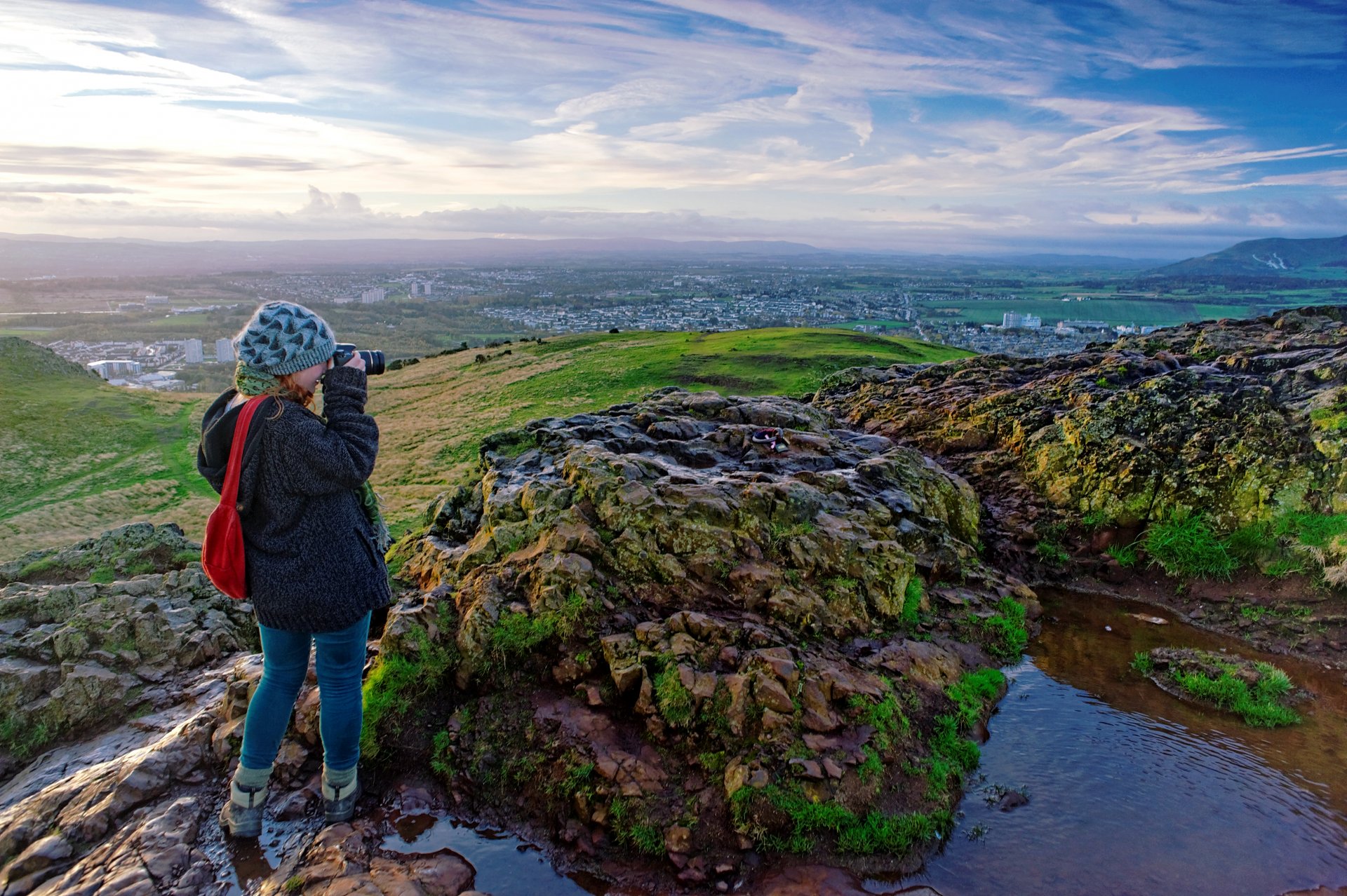 Fille photographier la nature dans les collines - fond d'écran de bureau