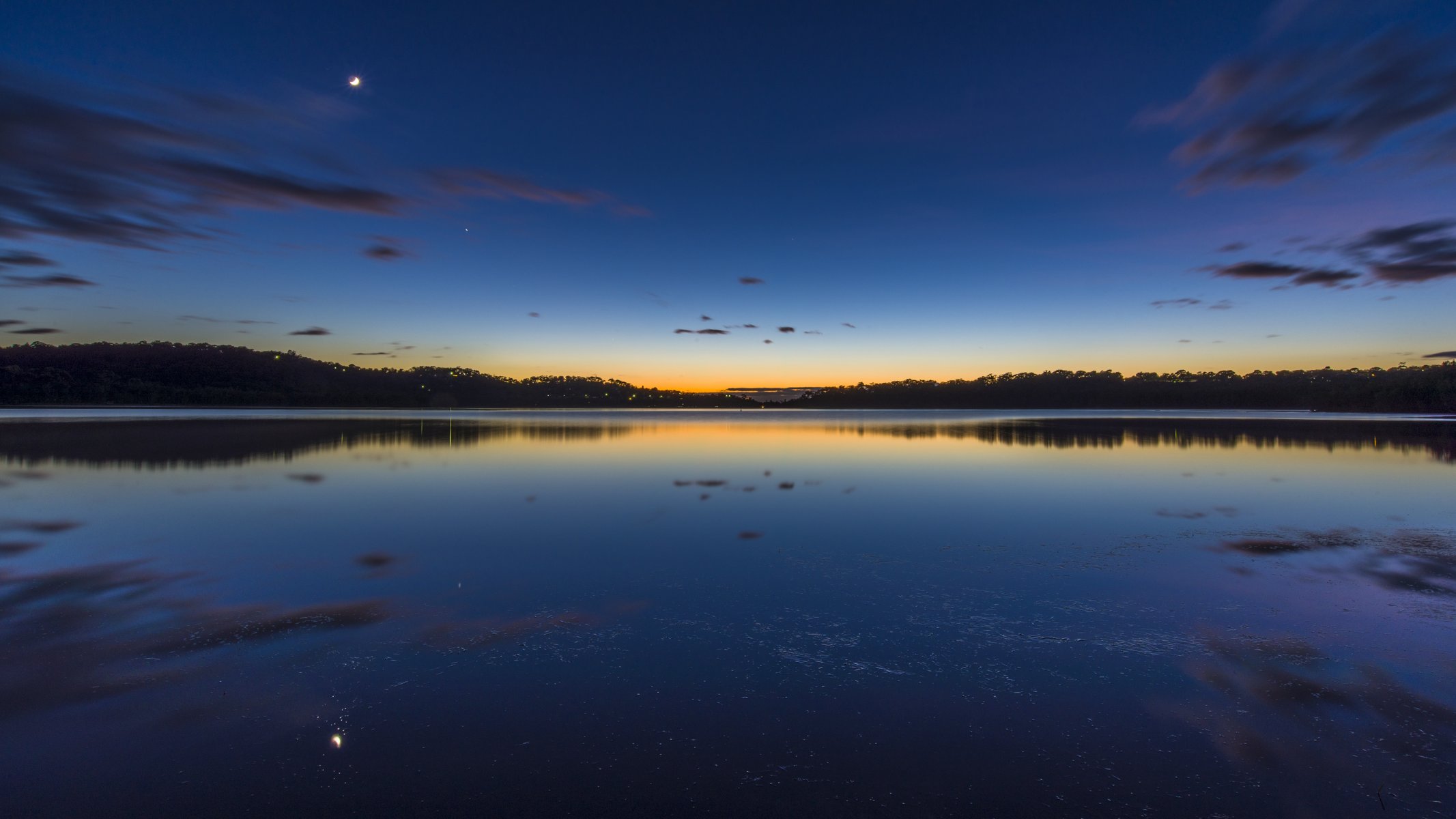 Tags:lac, crépuscule, mois, nuages, horizon