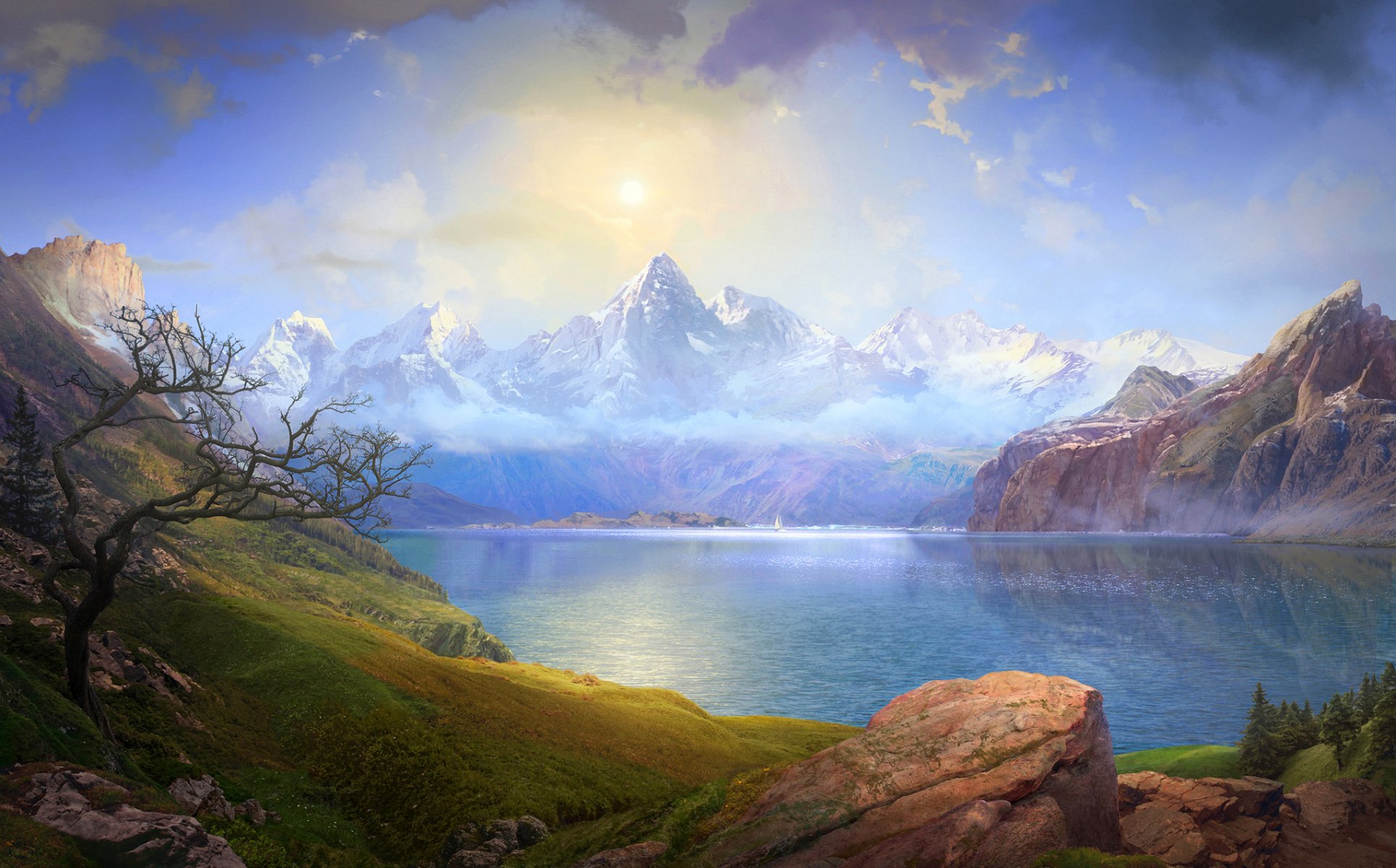 Tags:ciel, nuages, montagnes, lac, bateau, voile, roches, pierres