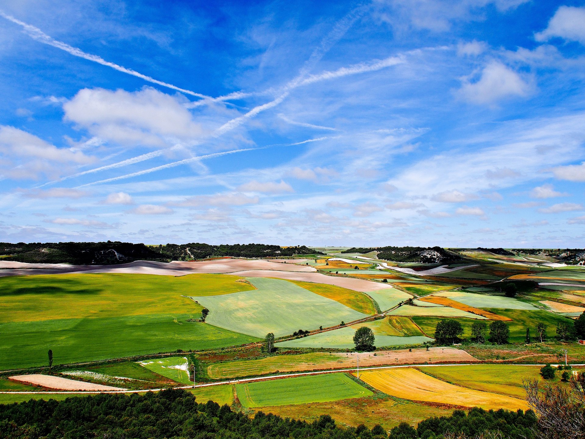 Tags:vallée, champs, routes, arbres, collines, ciel, nuages
