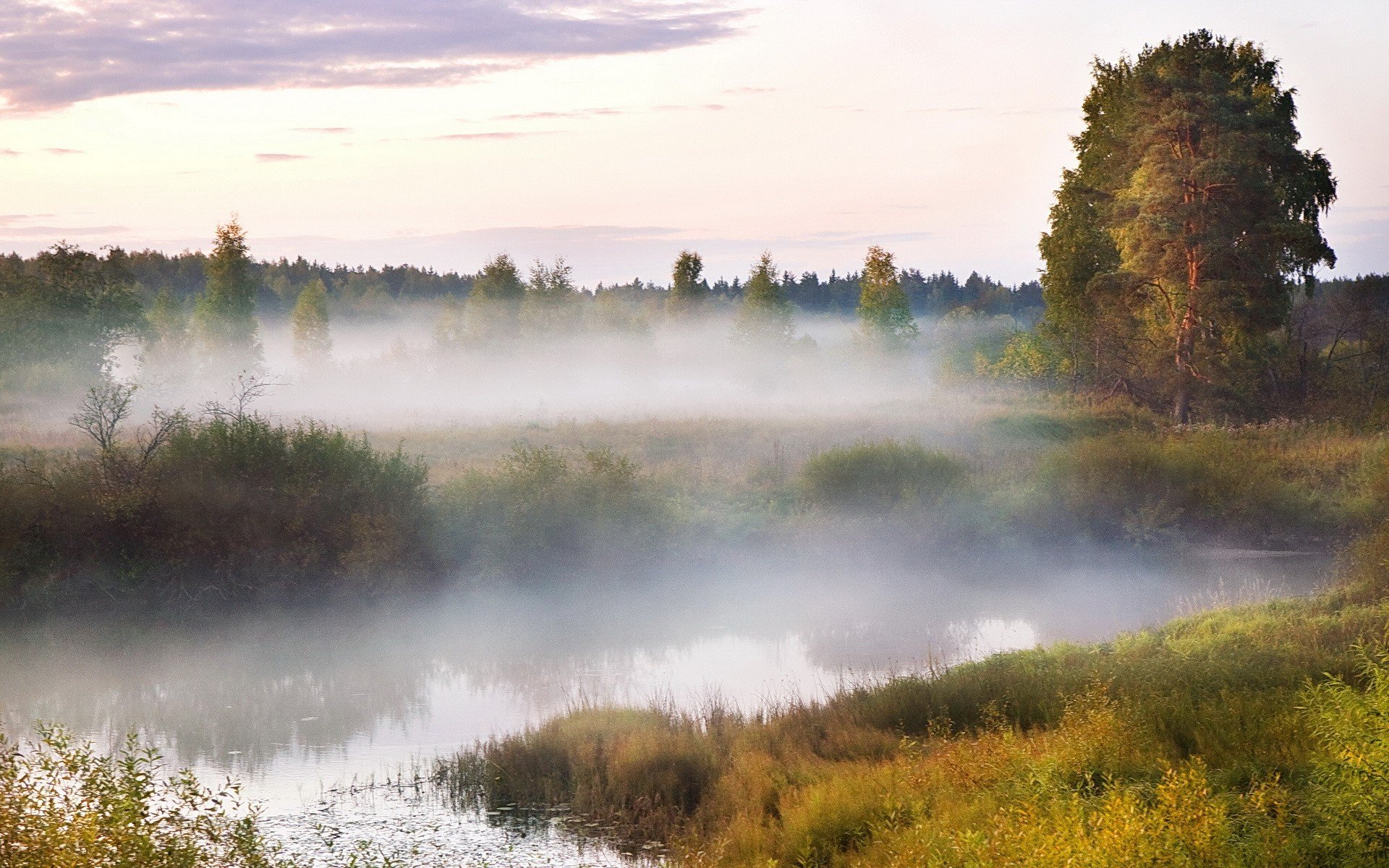 Le brouillard a couvert les arbres et les marais - fond d'écran de bureau
