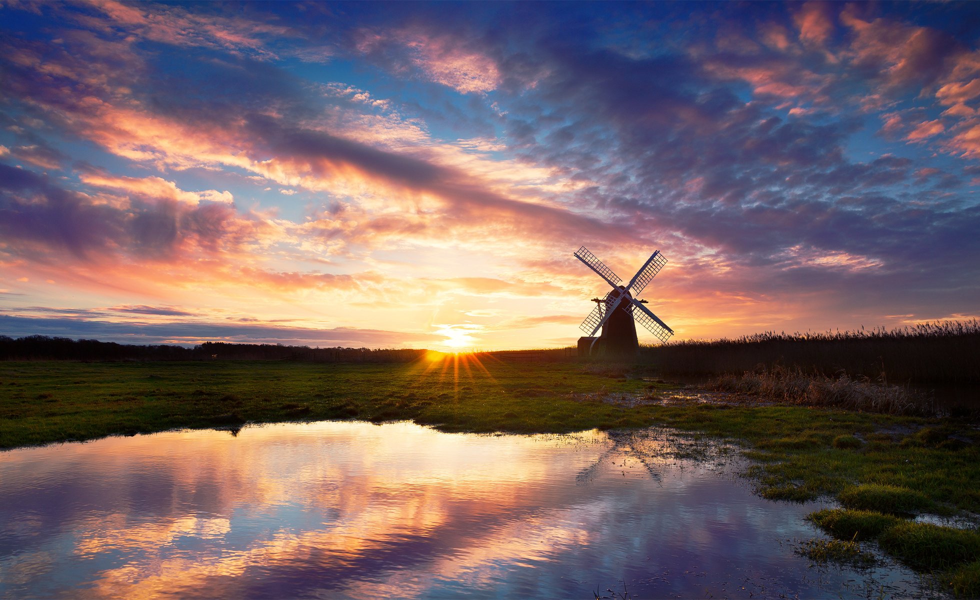 moulin à vent lac eau ciel soir coucher de soleil soleil réflexions