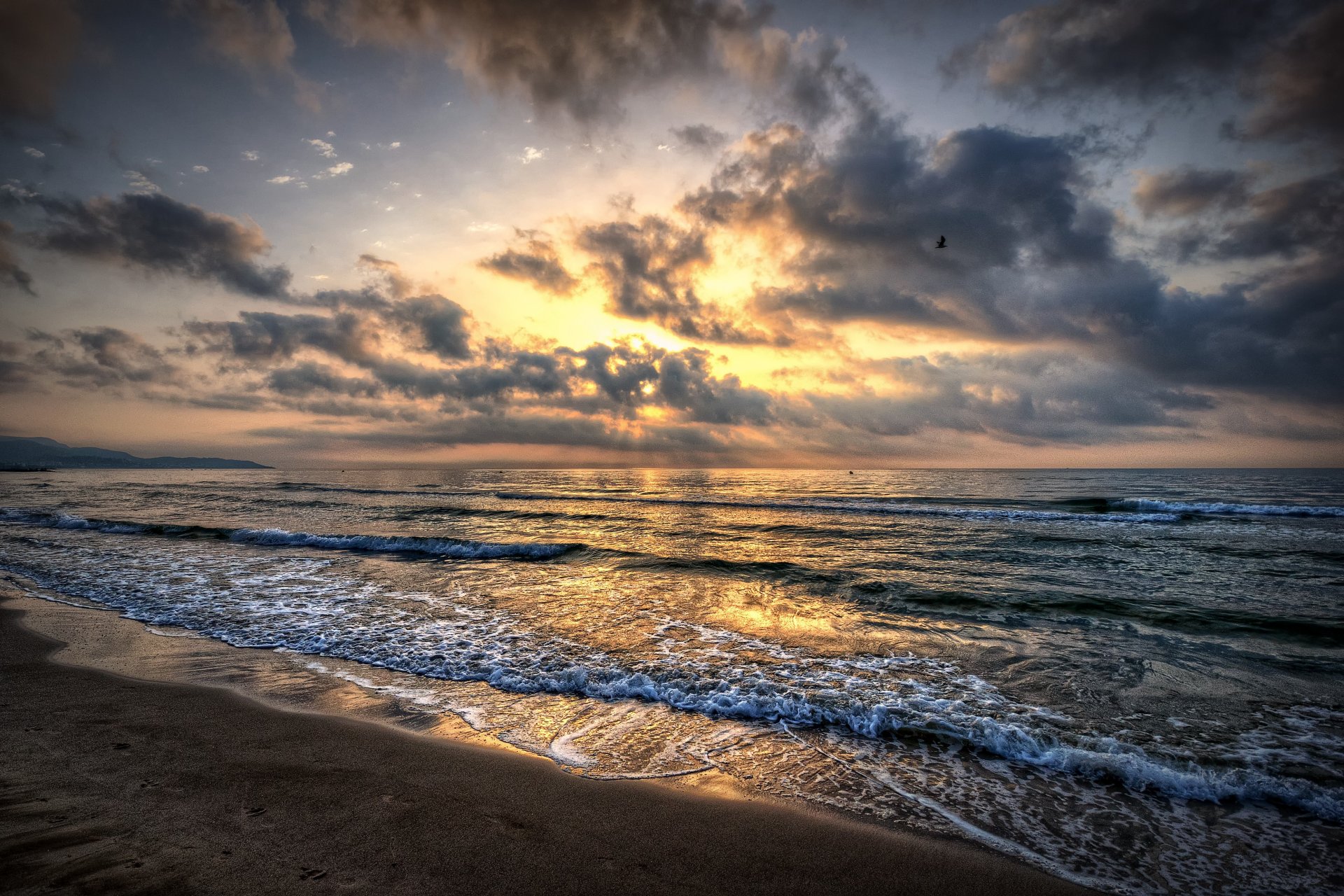 Mer avec les vagues et le sable au coucher du soleil - fond d'écran de bureau