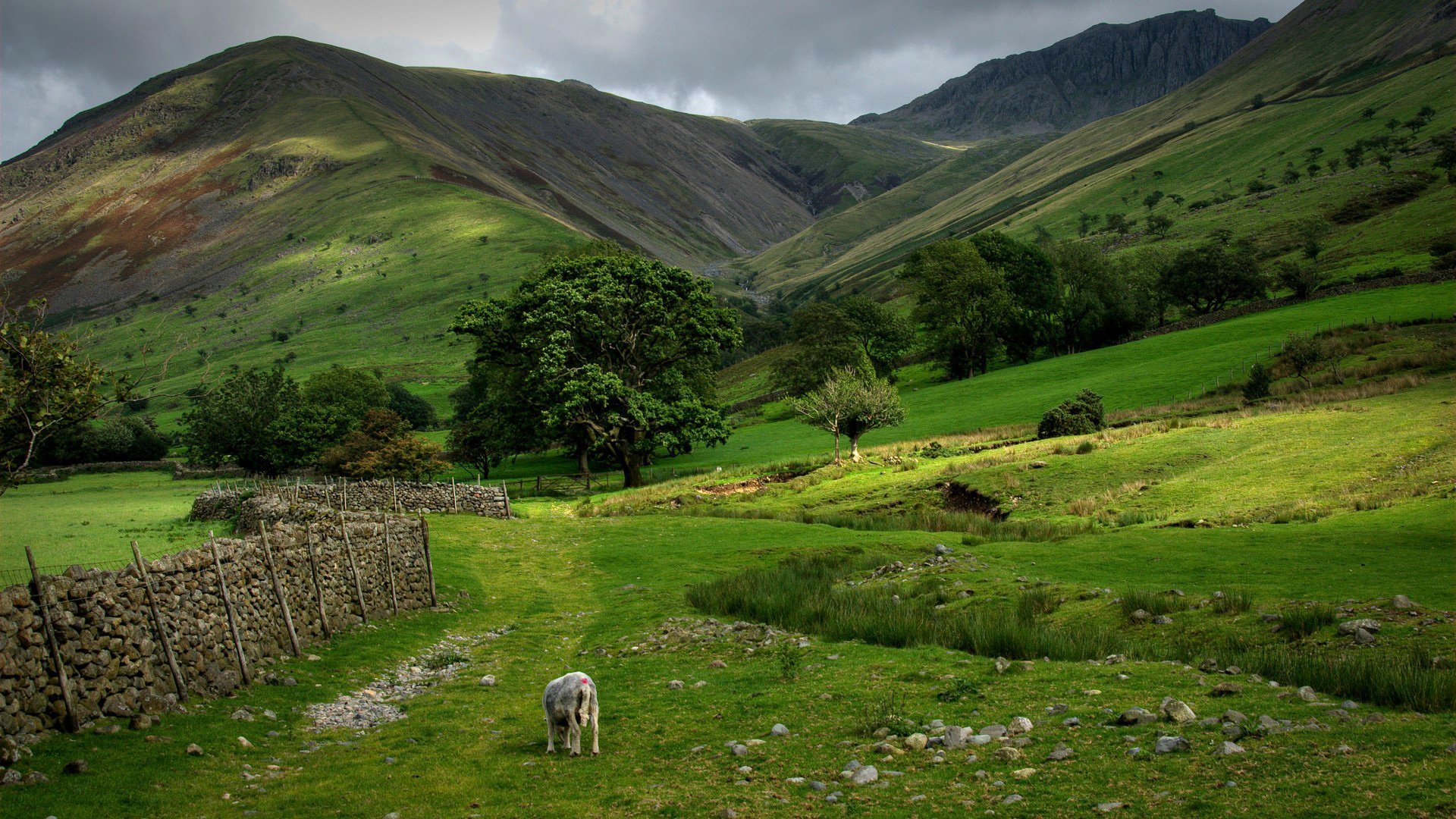 Tags:écosse, ciel, nuages, montagnes, herbe, clôture, mouton, arbres